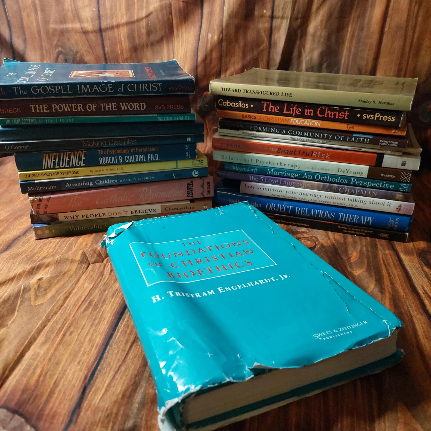 This lot includes various books on Christian theology, ethics, and psychology. Titles cover topics such as Christian bioethics, the gospel image of Christ, the psychology of persuasion, and relational psychotherapy. Included are works by H. Tristram Engelhardt Jr., Robert B. Cialdini, and Margaret E. Mohrmann.