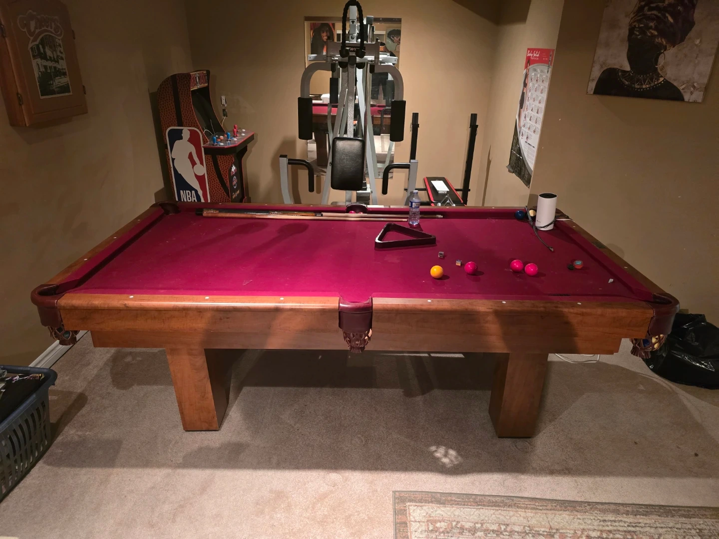 A classic pool table featuring a vibrant burgundy felt playing surface. The wooden frame and legs provide a sturdy and timeless look. It's ready for some friendly games! This table would be great for a home game room or basement entertainment area. Balls and practice balls included as eell as pool cues included. PICK UP ONLY.