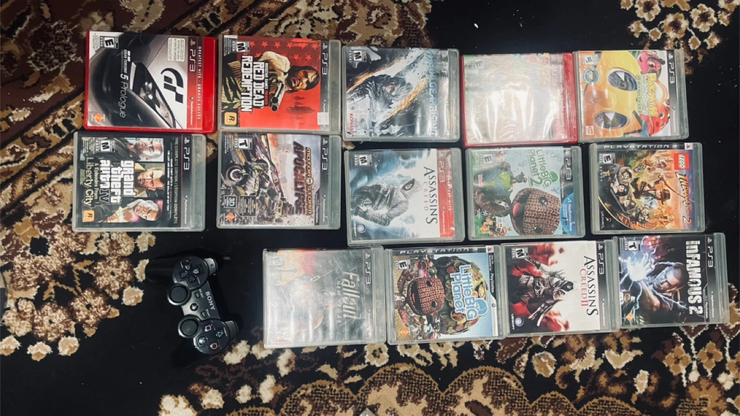 Collection of PS3 games including Gran Turismo 5, Red Dead Redemption, Grand Theft Auto IV, Assassin's Creed series, LittleBigPlanet 2, Fallout: New Vegas, Infamous 2, and more. Comes with a Sony DualShock 3 controller. All games are for the PlayStation 3 console.