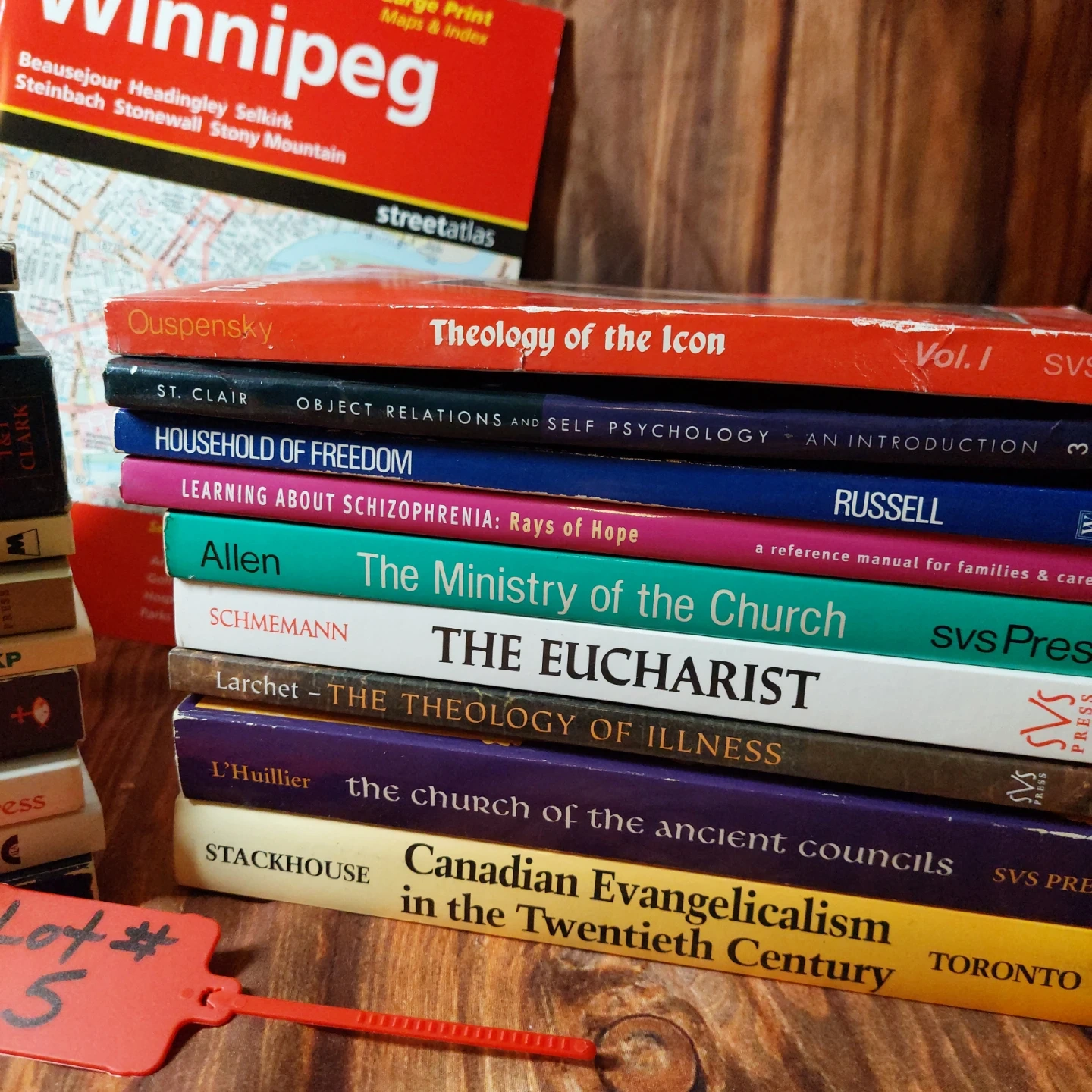 Lot # 5 containing books covering theology, ministry, and self-psychology. Includes 'Theology of the Icon', 'The Eucharist', 'The Ministry of the Church', and 'Canadian Evangelicalism in the Twentieth Century'. Also includes a large print Winnipeg street atlas. Books are in good condition.