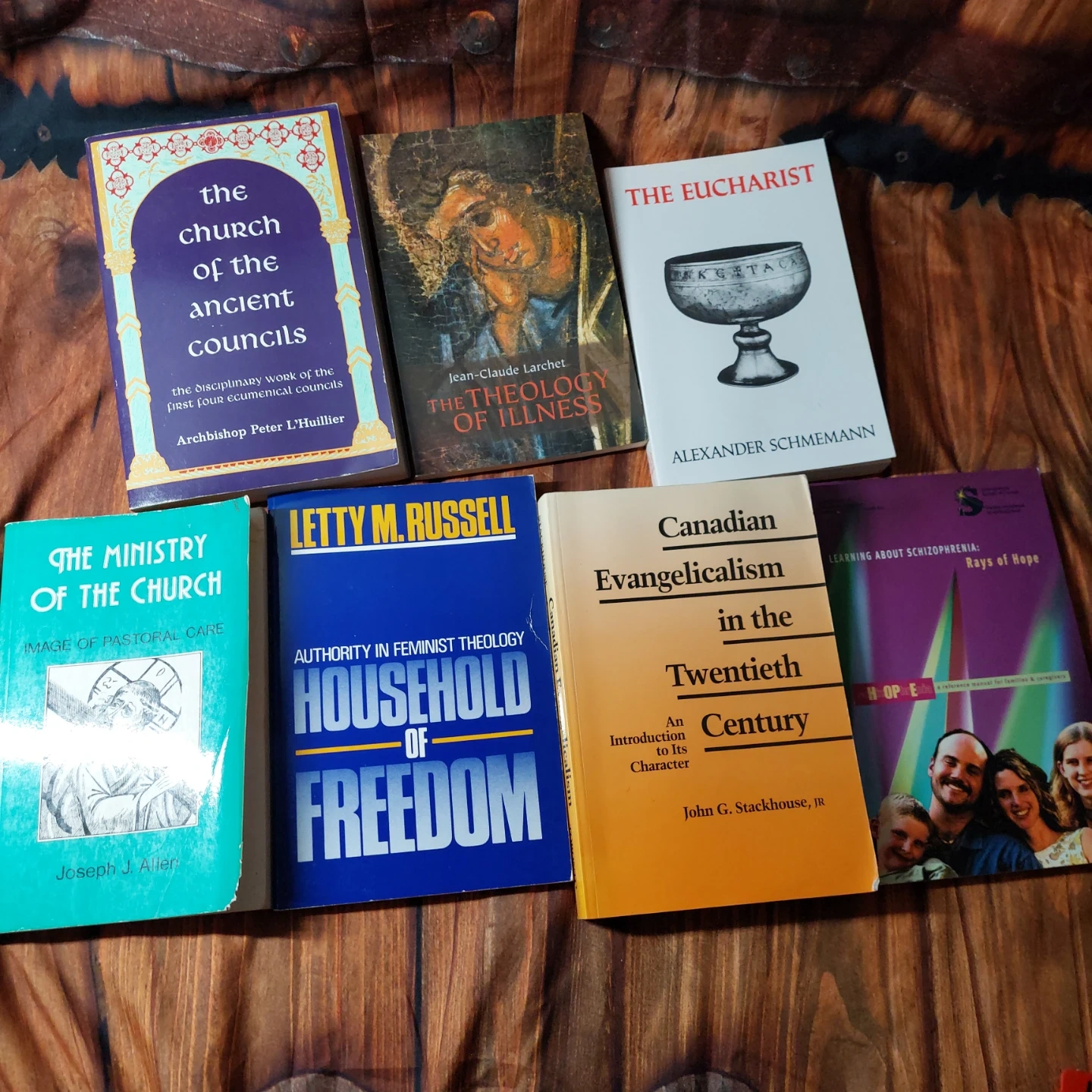 Lot # 5 containing books covering theology, ministry, and self-psychology. Includes 'Theology of the Icon', 'The Eucharist', 'The Ministry of the Church', and 'Canadian Evangelicalism in the Twentieth Century'. Also includes a large print Winnipeg street atlas. Books are in good condition.