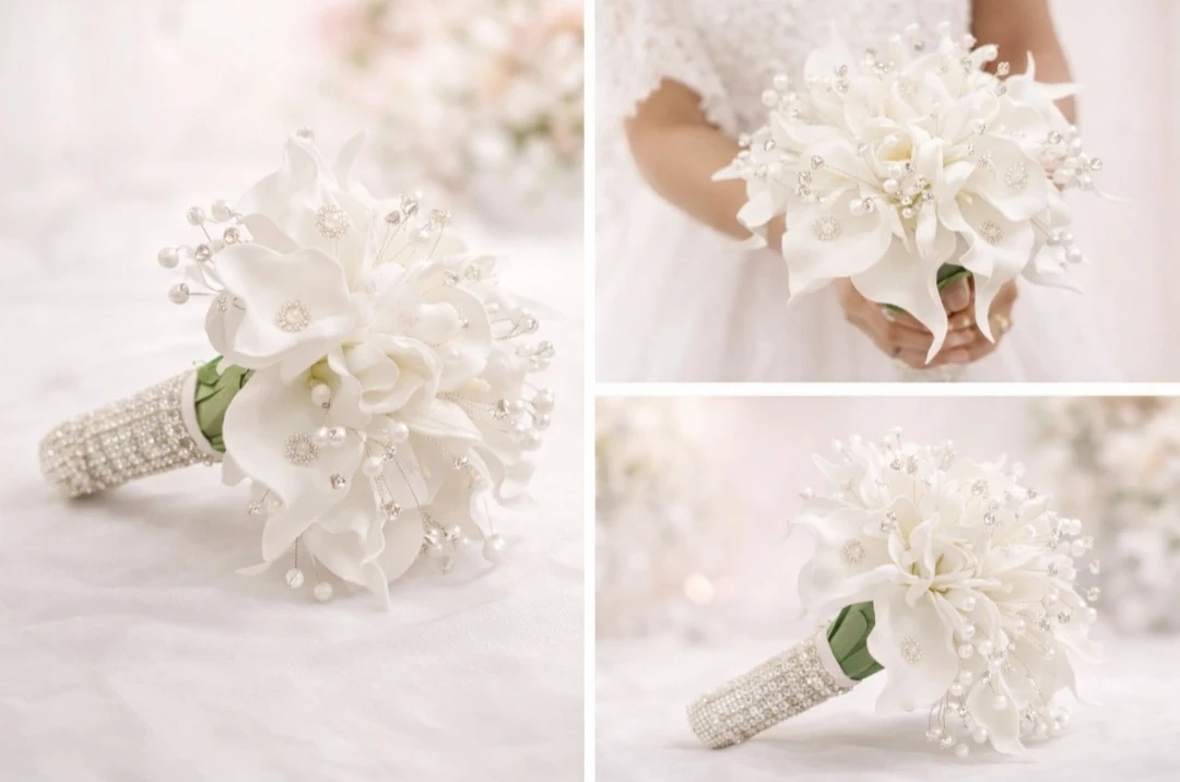 Beautiful white bridal bouquet featuring calla lilies and tulips. It's adorned with sparkling rhinestones and faux pearls, with a decorative handle wrapped in silver ribbon and gems. This stunning arrangement is perfect for a wedding.