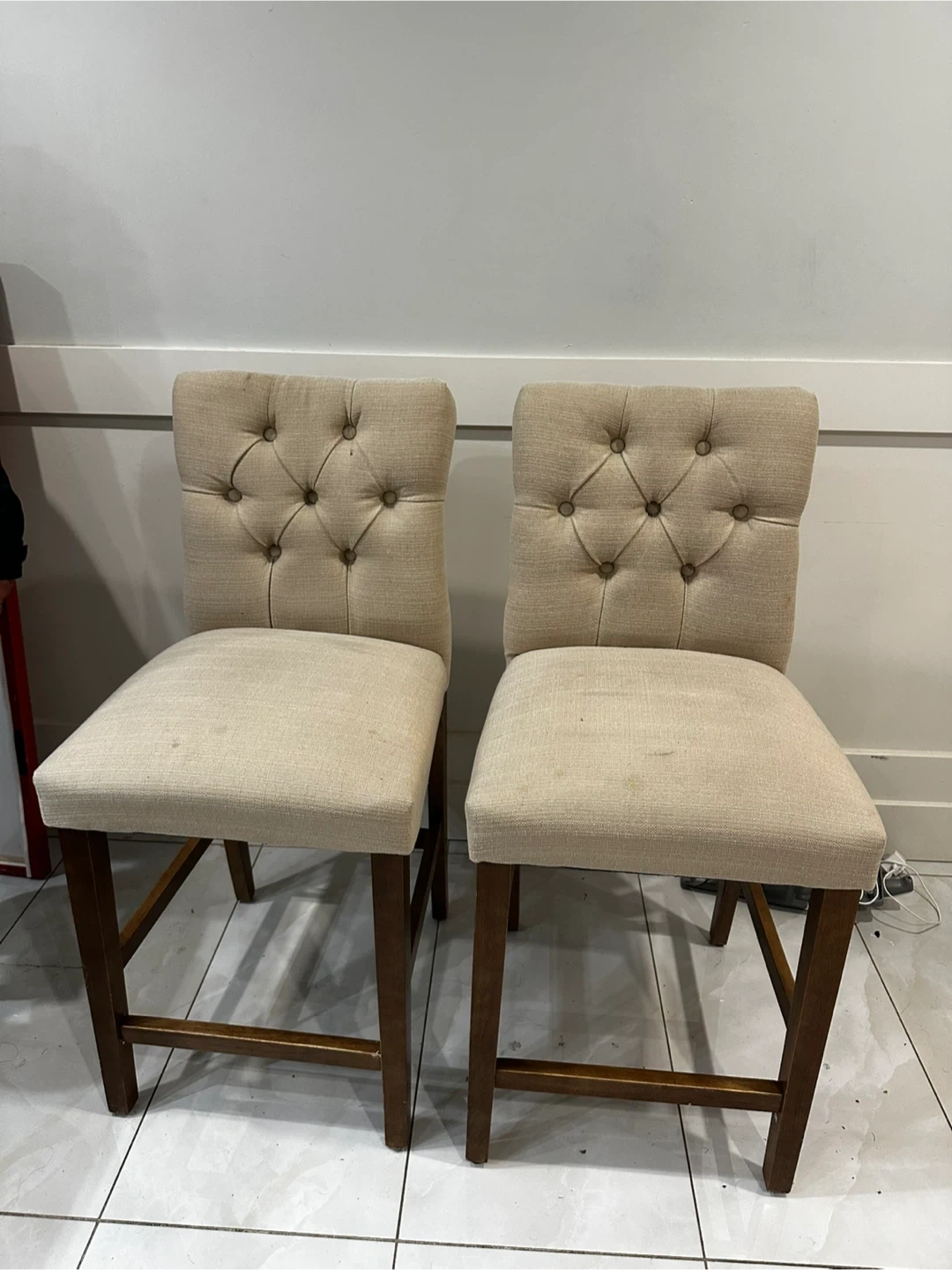 Selling a pair of upholstered counter height stools with wooden legs. They feature diamond tufting on the backrests and light-coloured fabric seats. The overall height appears to be around 39 inches, with the seat height being approximately 26 inches.