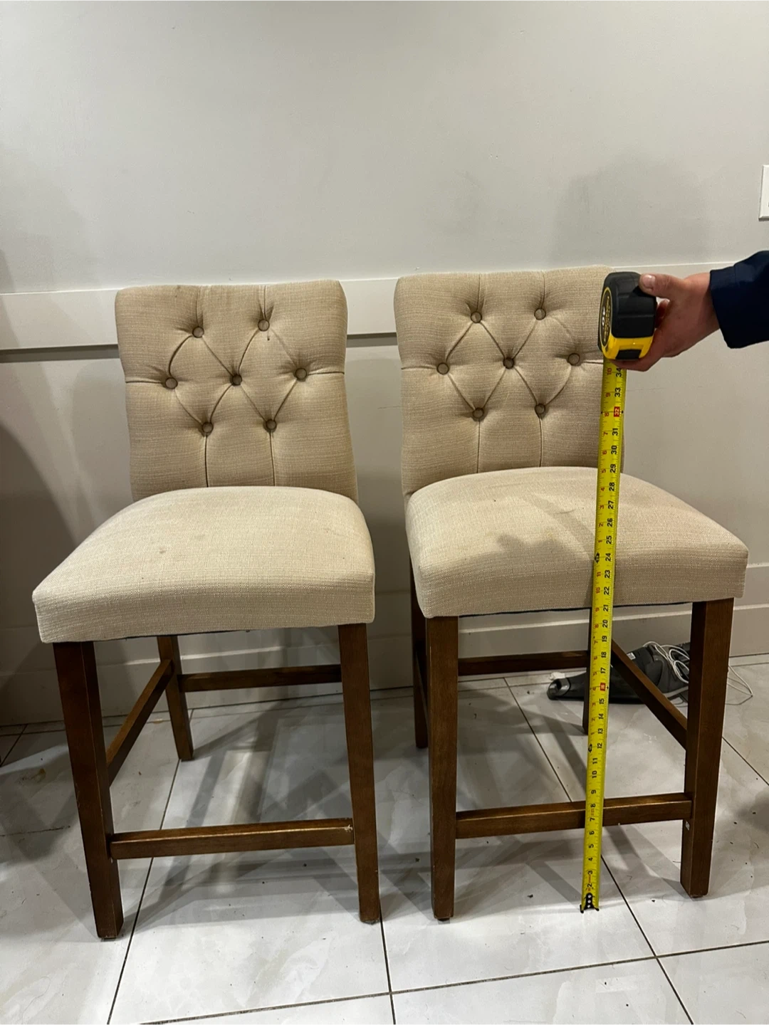 Selling a pair of upholstered counter height stools with wooden legs. They feature diamond tufting on the backrests and light-coloured fabric seats. The overall height appears to be around 39 inches, with the seat height being approximately 26 inches.