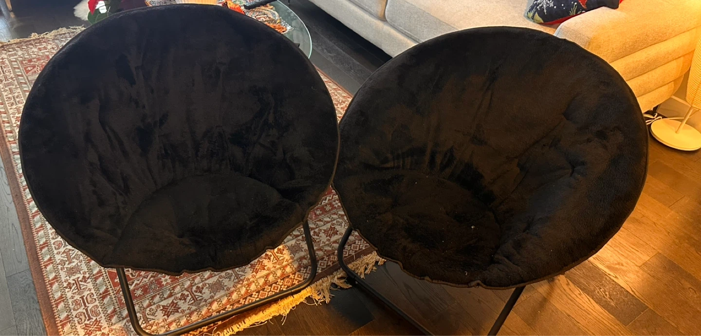 This comfy black faux fur moon chair has a plush seat and a metal frame. It's a fun accent chair that's perfect for a bedroom or living space. The chair's circular design offers a cozy spot to relax. Both all black and brand new from Walmart