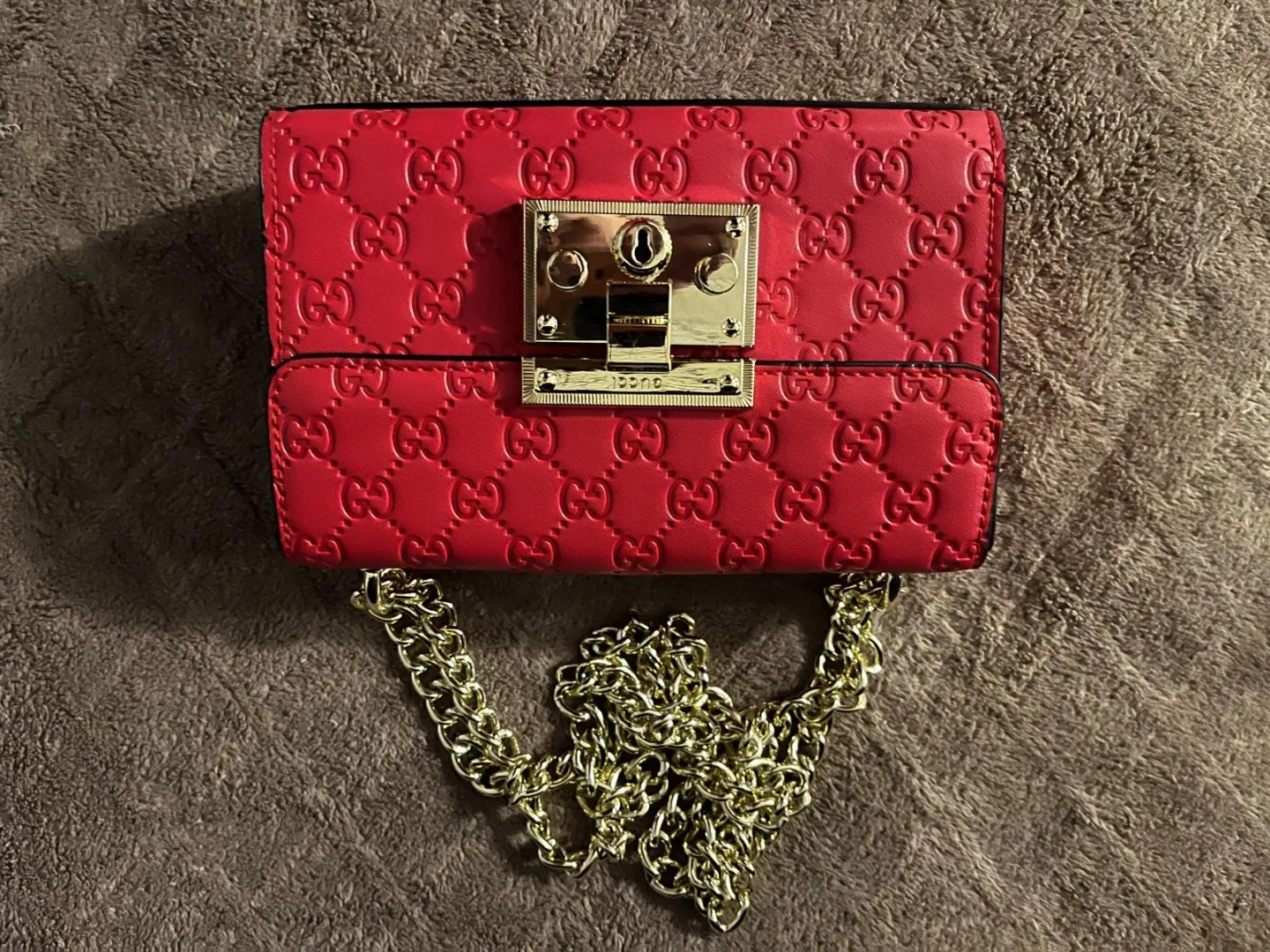 This is a red Gucci chain bag with an embossed GG pattern. It features a gold-tone lock closure and a detachable gold chain strap. Pleather.