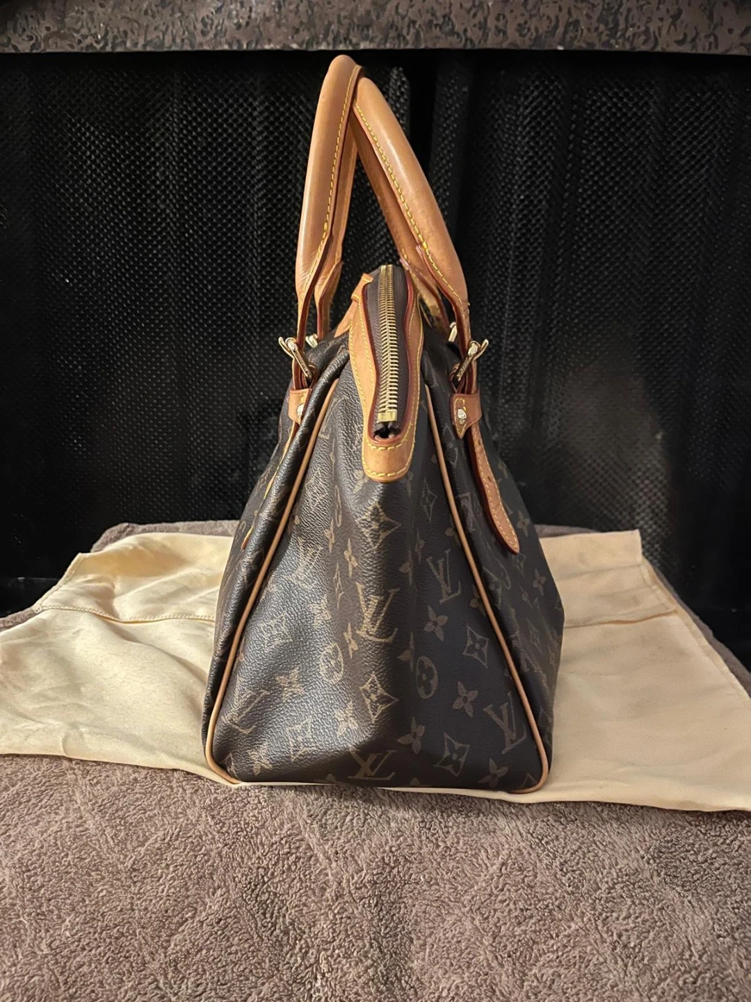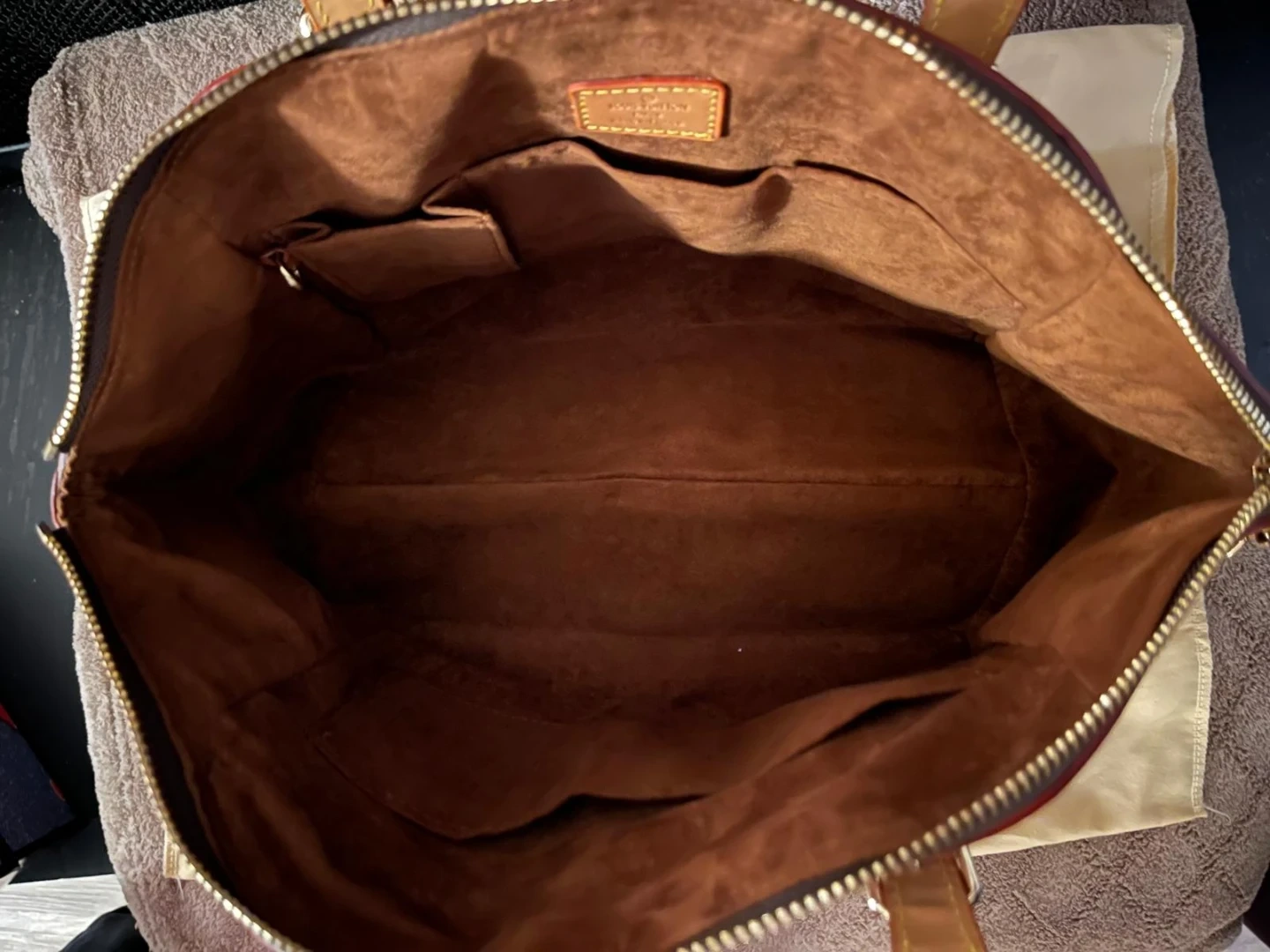 Louis Vuitton Speedy handbag in signature monogram canvas. It features tan leather trim and handles, and a zippered top closure. The interior is lined with brown suede and has multiple pockets.