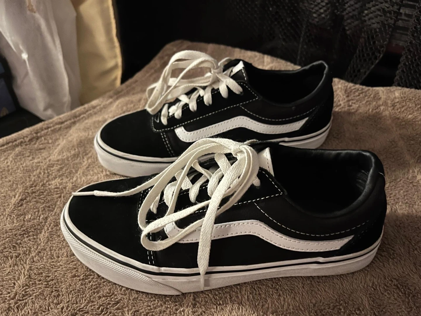 Classic Vans Old Skool sneakers in black and white. These shoes feature a durable canvas and suede upper with signature side stripe detailing. They have a padded collar and rubber waffle outsole for comfort and grip. These are great for everyday wear!
