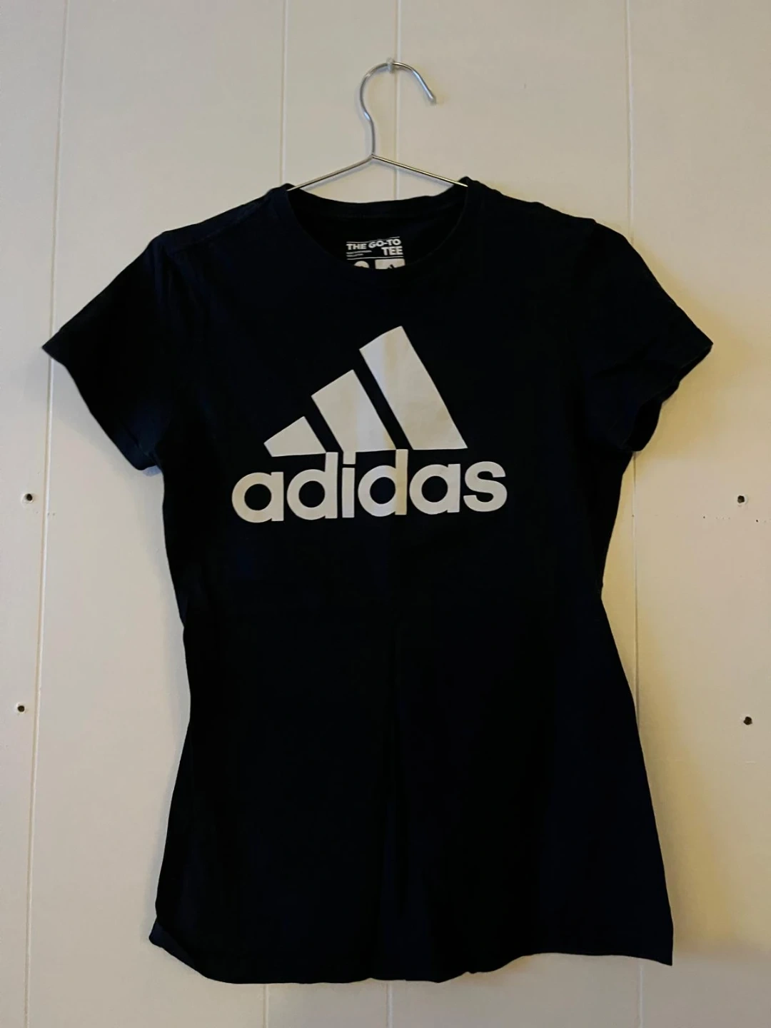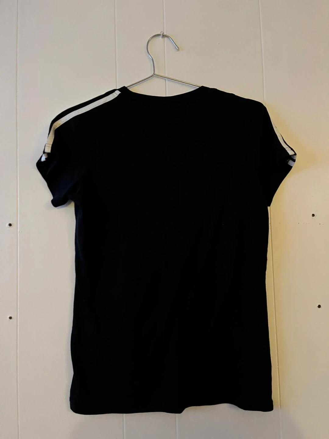 2 black 1 grey adidas t-shirt with the iconic white three stripes on the shoulders. It's made from a comfortable fabric, perfect for everyday wear. The size is medium.