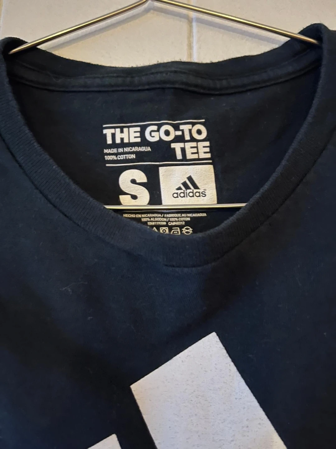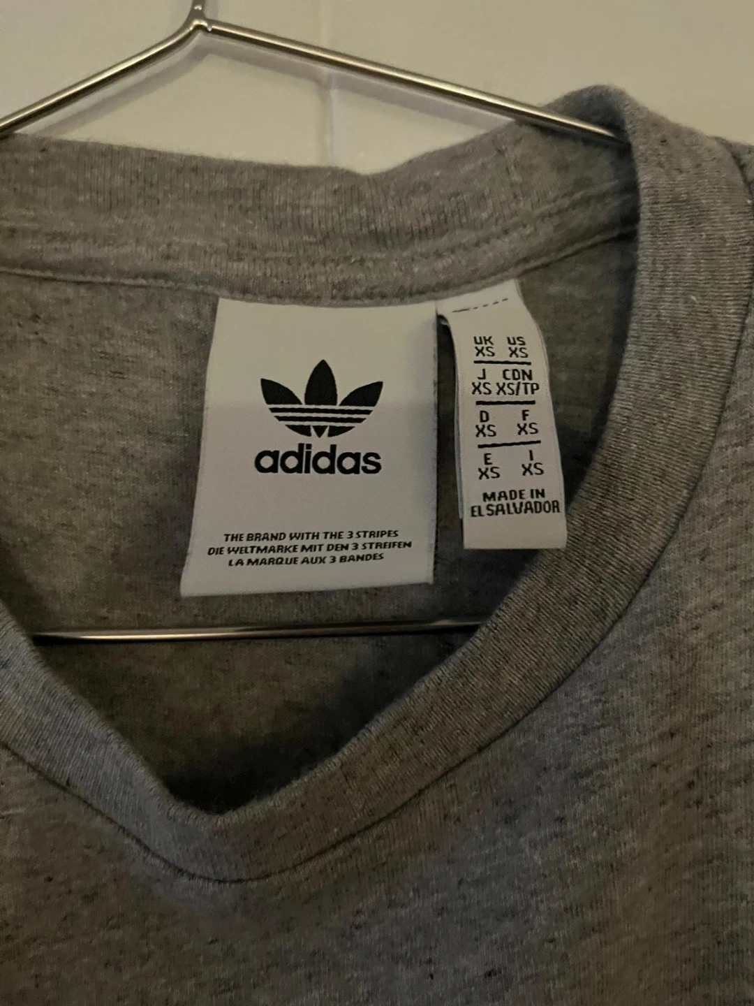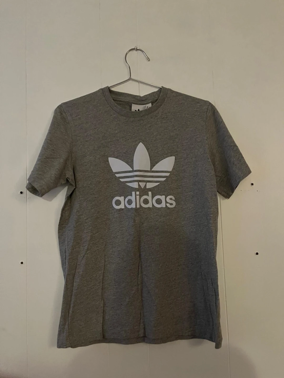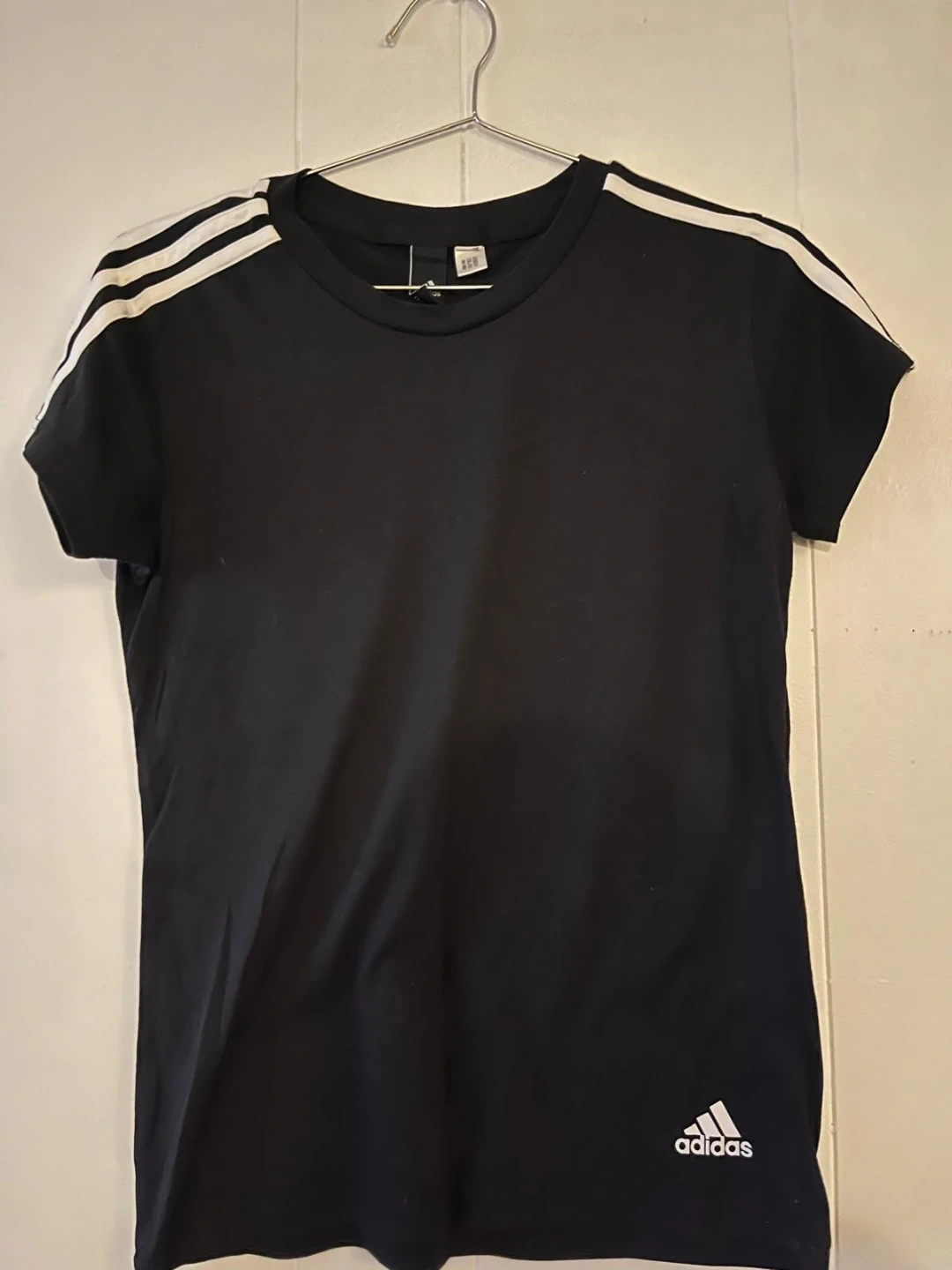2 black 1 grey adidas t-shirt with the iconic white three stripes on the shoulders. It's made from a comfortable fabric, perfect for everyday wear. The size is medium.