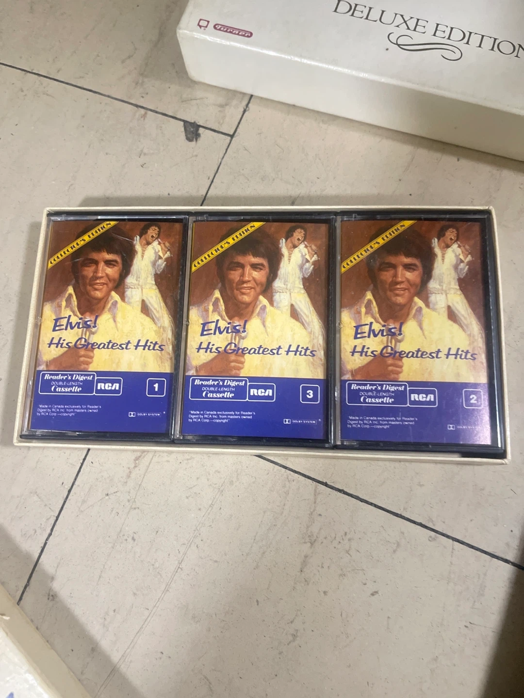 Reader's Digest Collector's Edition 3-cassette set featuring Elvis Presley's greatest hits. This collection includes multiple albums of his popular music. A great addition for any Elvis fan's collection!