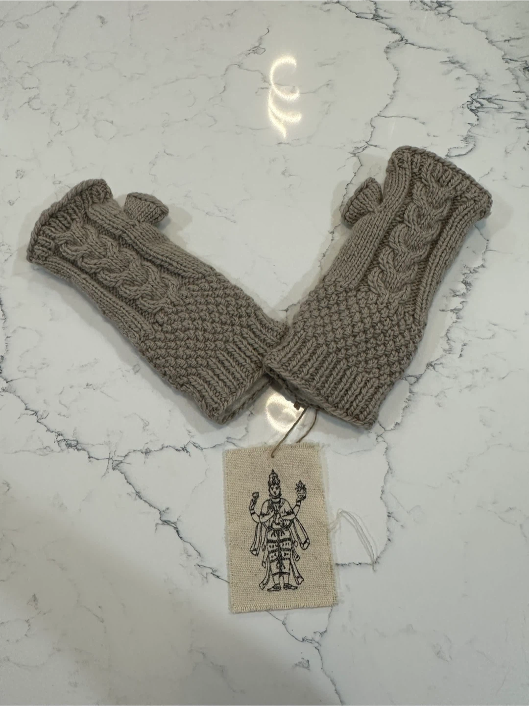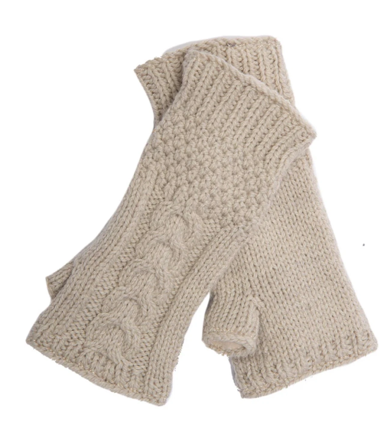 Nirvanna Designs cable handwarmers in Linen color. They're made with 100% wool and hand-knitted in Nepal. These fingerless gloves allow for easy use of your hands while keeping them warm.