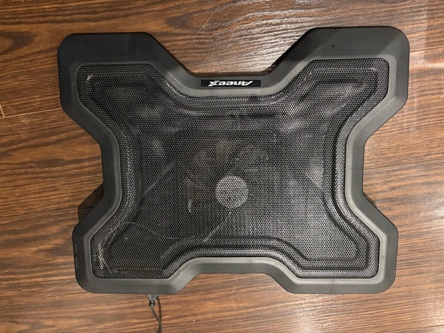 Aneex laptop cooling pad in excellent condition. This X-shaped stand features a quiet central fan to keep your laptop cool and prevent overheating during gaming, work, or streaming. USB-powered (plugs right into your laptop—no extra outlet needed), with a mesh surface for better airflow. Fits laptops up to 17 inches. Adjustable angle for ergonomic viewing. Lightweight and portable, easy to store. Used lightly, fan works perfectly, no scratches or issues. Perfect for MacBooks, Windows laptops, or gaming rigs.
