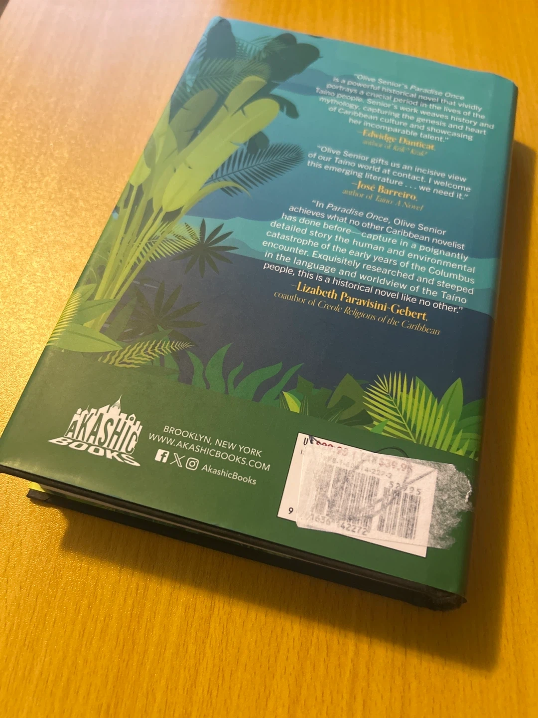 This is the novel Paradise Once by Olive Senior. It's described as weaving history and mythology to capture the genesis and heart of Caribbean culture.