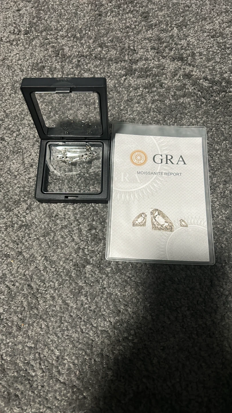 Moissanite stud earrings presented in a protective case. Comes with a GRA Moissanite Report for verification. These earrings are suitable for everyday wear or special occasions.