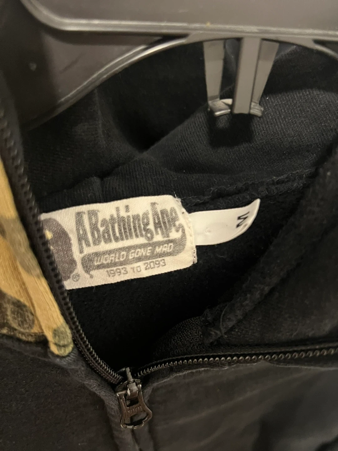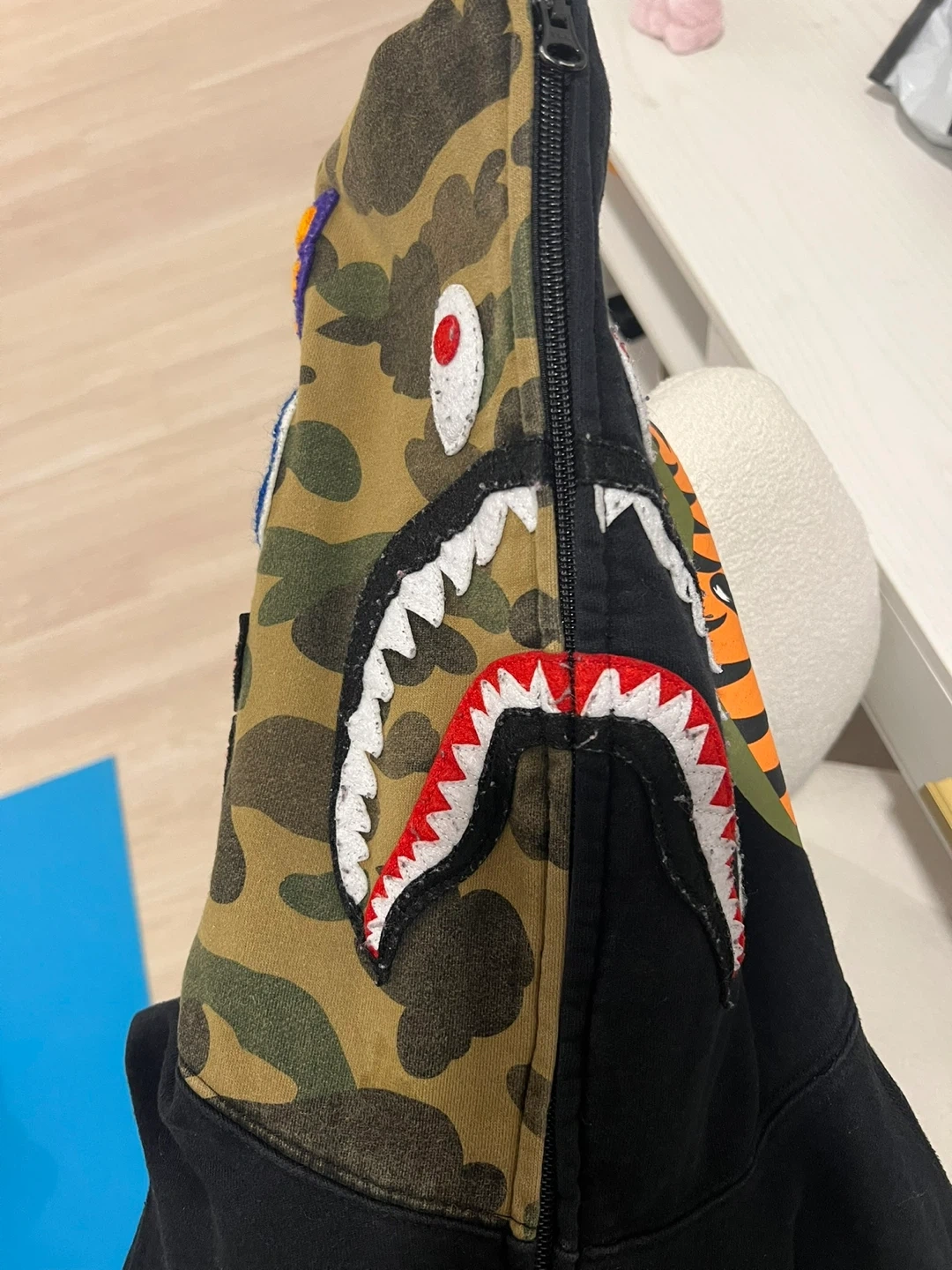 Iconic A Bathing Ape full zip hoodie. Features the signature shark graphic and camouflage print. This hoodie is size M. It's made with comfortable, durable material for everyday wear. Authentic. Open to offers.
