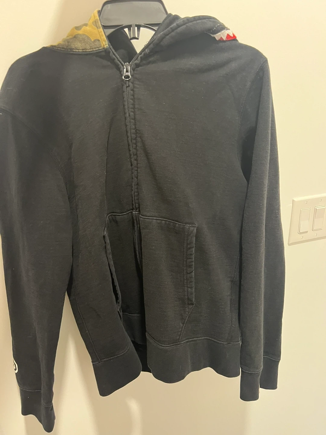 Iconic A Bathing Ape full zip hoodie. Features the signature shark graphic and camouflage print. This hoodie is size M. It's made with comfortable, durable material for everyday wear. Authentic. Open to offers.