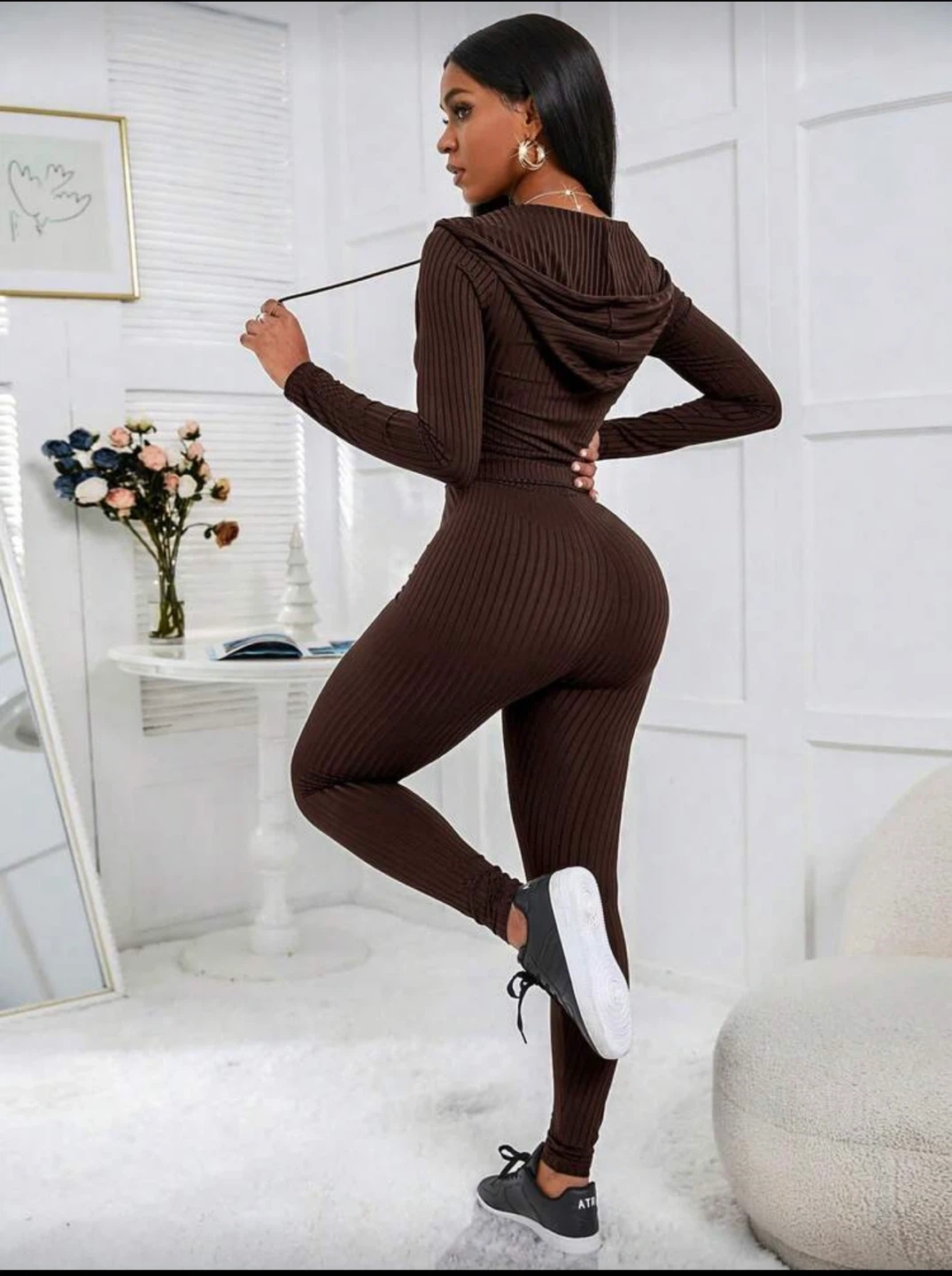 This two-piece set features a ribbed brown fabric with a zip-up hoodie and matching leggings. The hoodie has drawstrings at the hood and waist for a customizable fit. It's a comfortable and stylish outfit for casual wear.