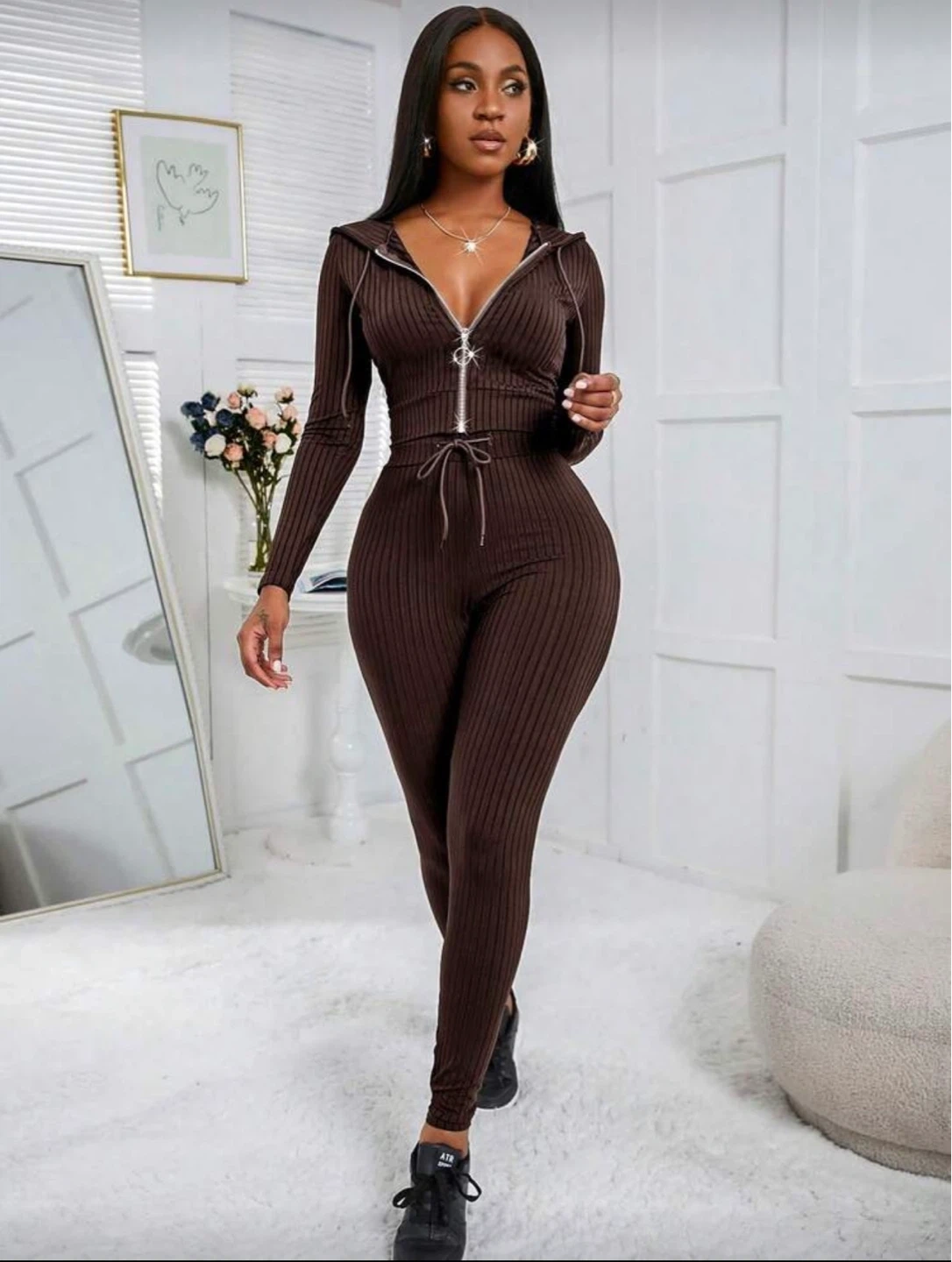 This two-piece set features a ribbed brown fabric with a zip-up hoodie and matching leggings. The hoodie has drawstrings at the hood and waist for a customizable fit. It's a comfortable and stylish outfit for casual wear.
