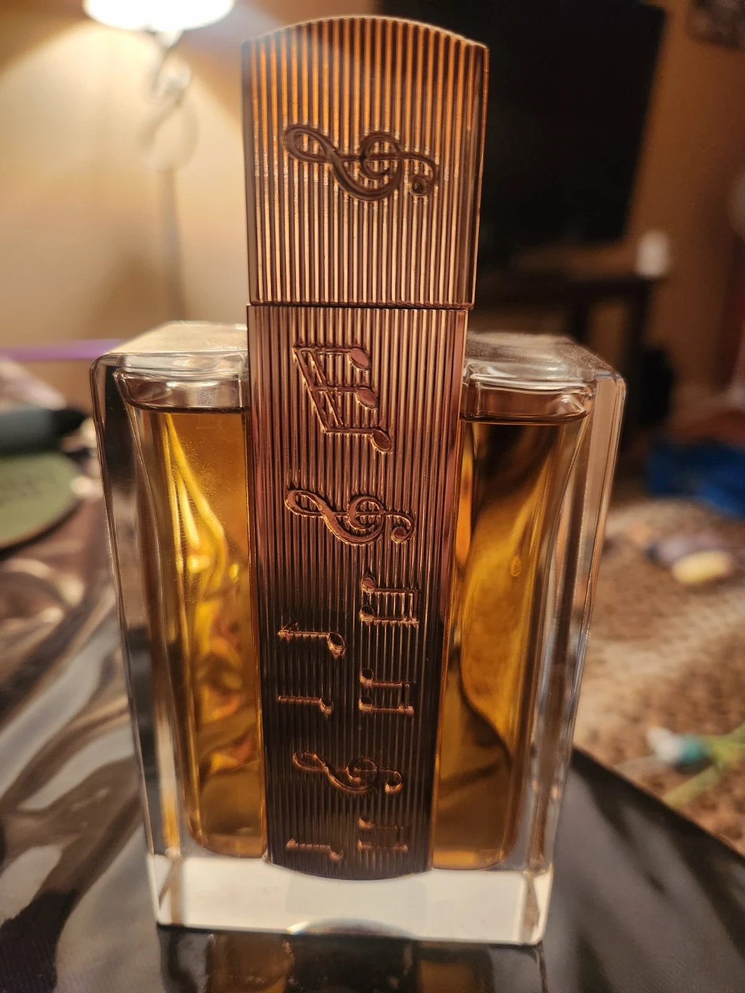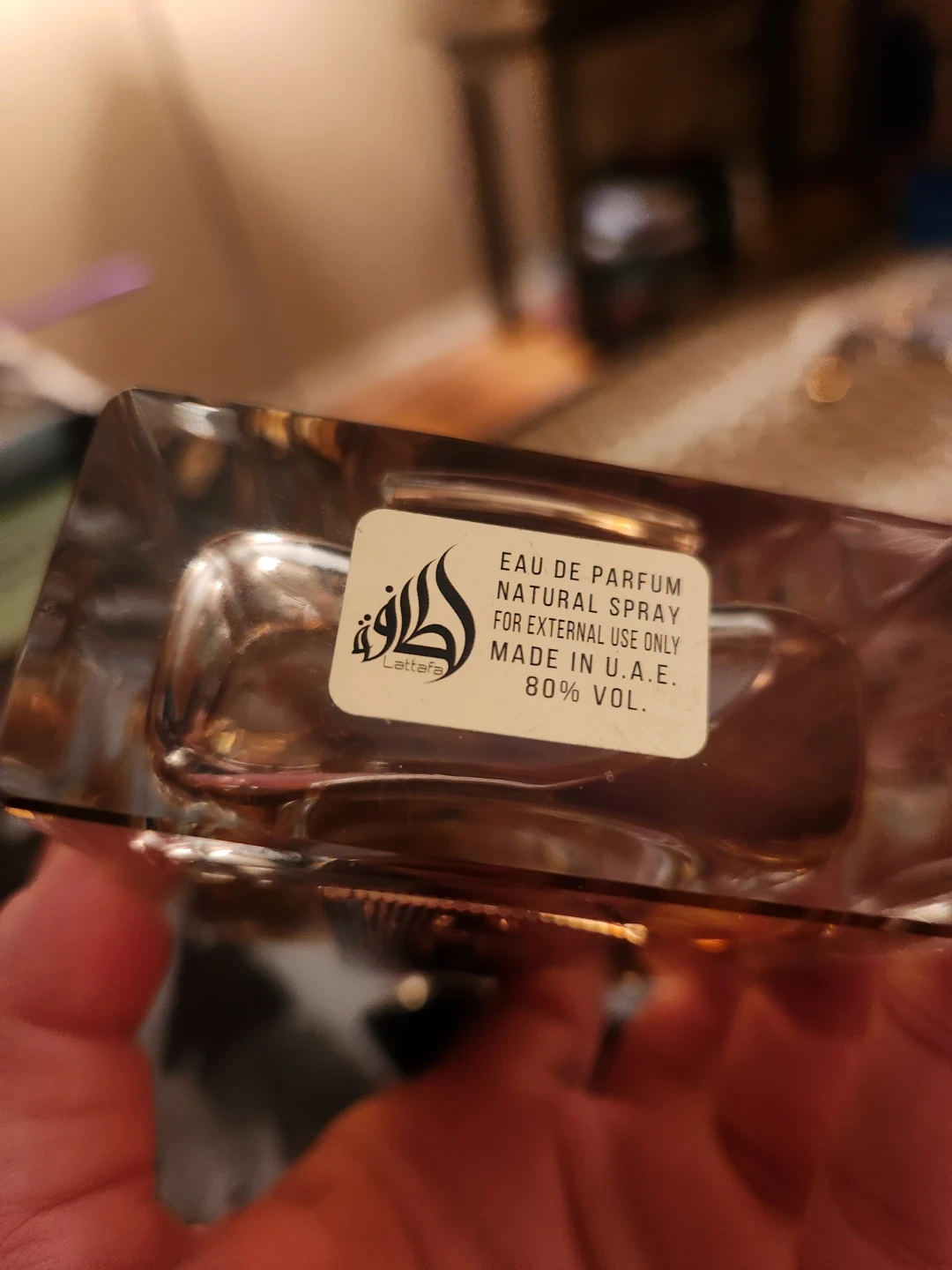 Lattafa Eau de Parfum Natural Spray for external use only. It's made in the U.A.E. with 80% vol. This perfume comes in a distinctive bottle with a musical note design.