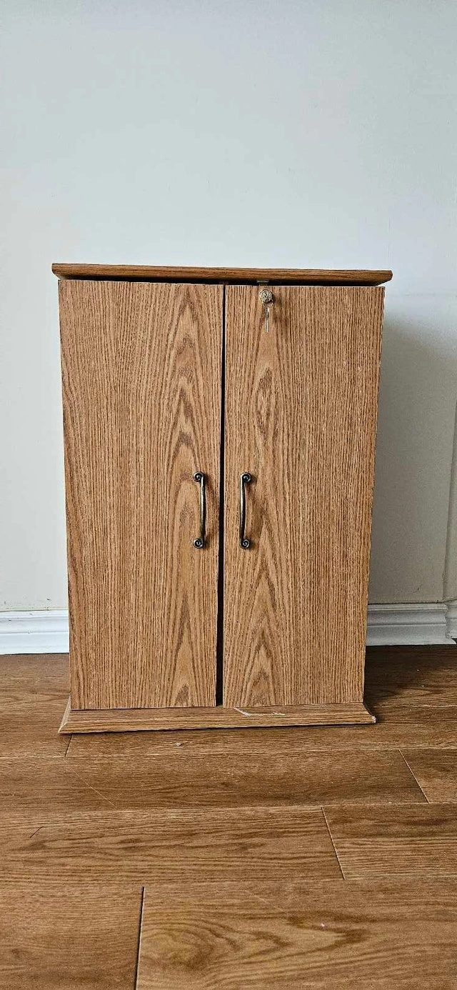 Selling a DVD cabinet in fair condition. Please note the cosmetic damage on the door as shown in the pictures. This media cabinet offers versatile storage with adjustable shelves, perfect for organizing movies or collectibles. Dimensions: