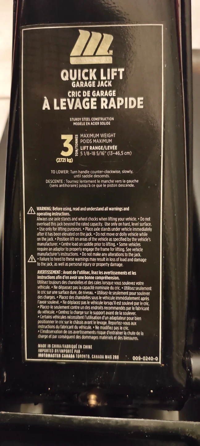 This Motomaster Quick Lift garage jack is made with sturdy steel construction. It has a maximum weight lift capacity of 3 tonnes or 5 1/8-5/16 inches. This jack is for lifting vehicles.