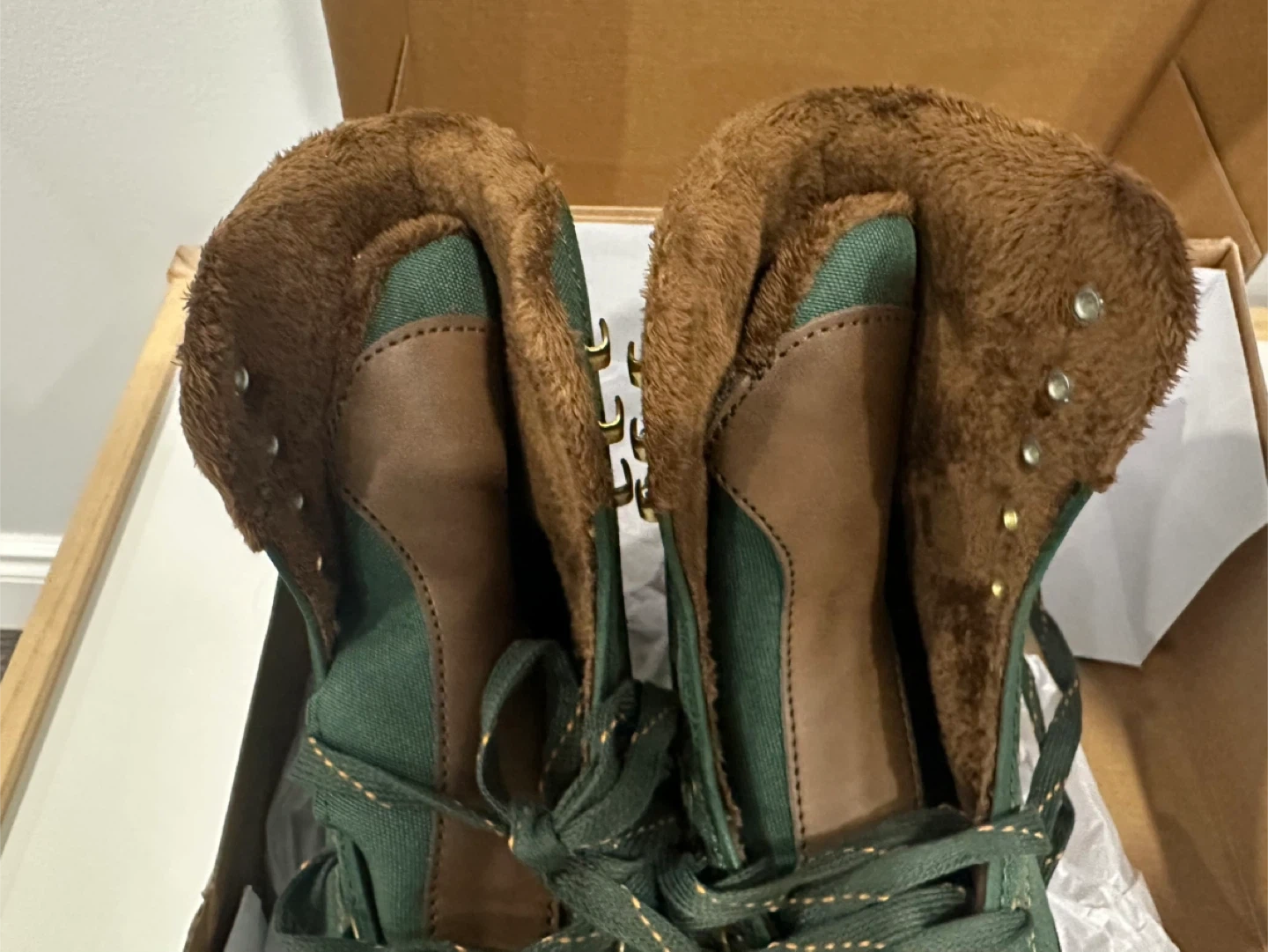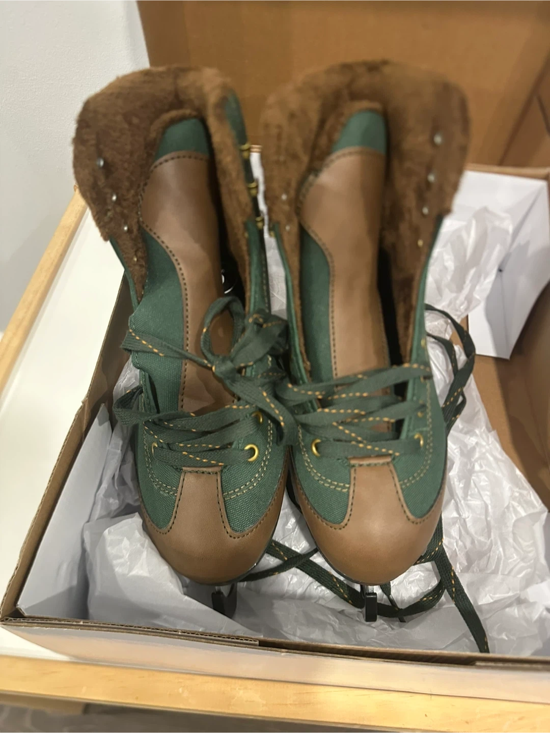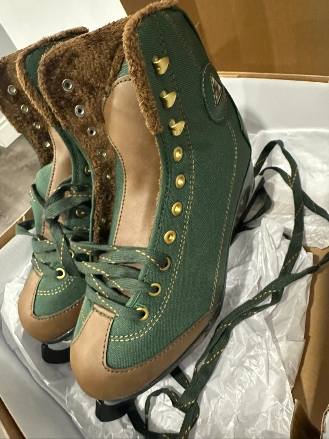 Comfortable women's figure skates in a forest green and brown canvas with a cozy faux fur lining. These skates feature a reinforced toe cap and sturdy blades. Still needs to be sharpened.