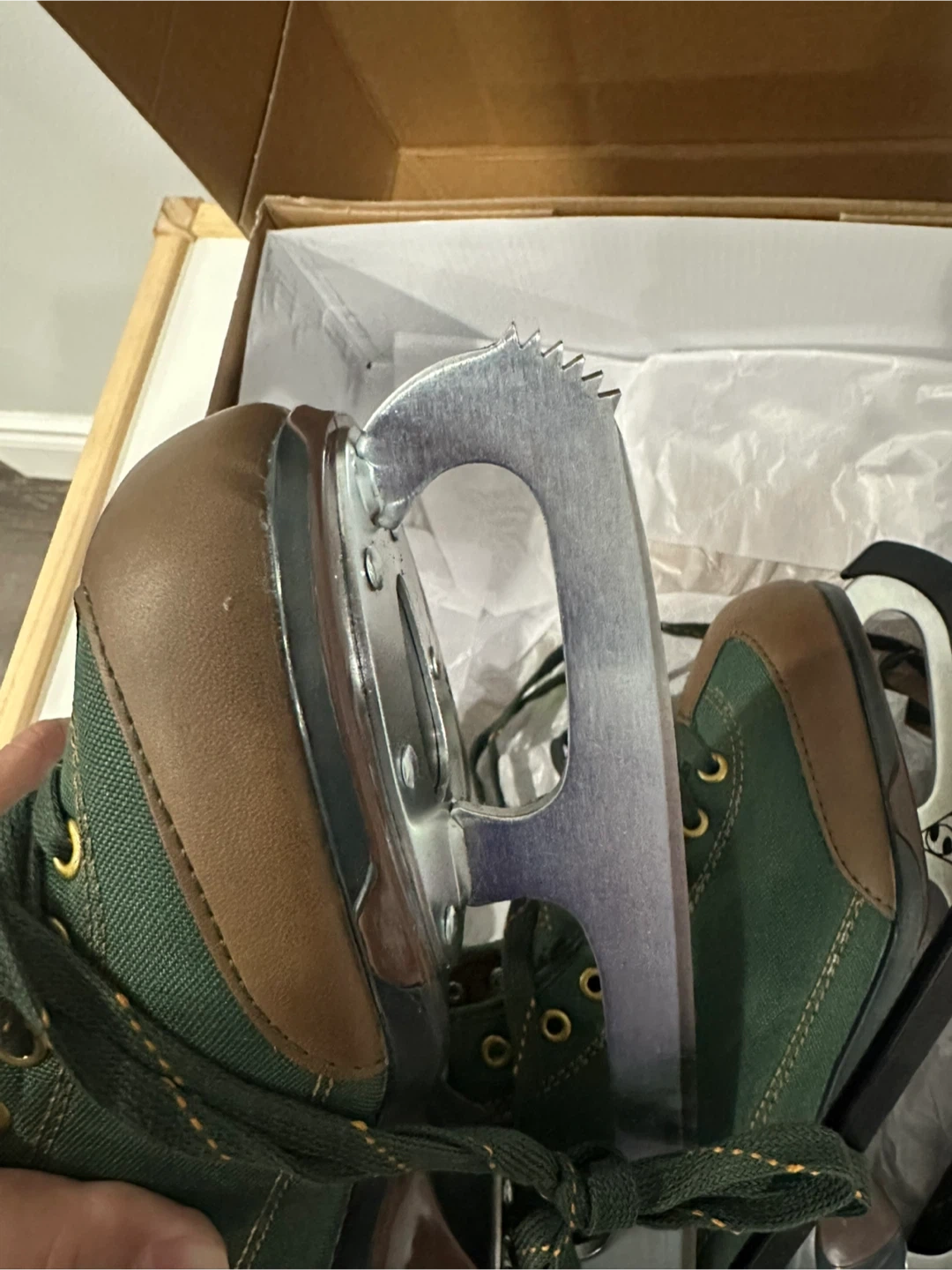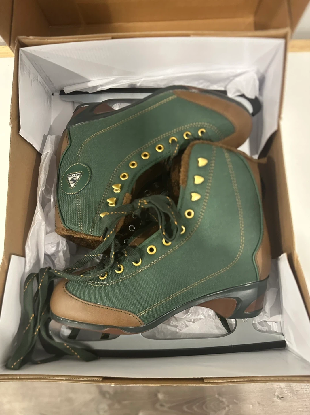 Comfortable women's figure skates in a forest green and brown canvas with a cozy faux fur lining. These skates feature a reinforced toe cap and sturdy blades. Still needs to be sharpened.