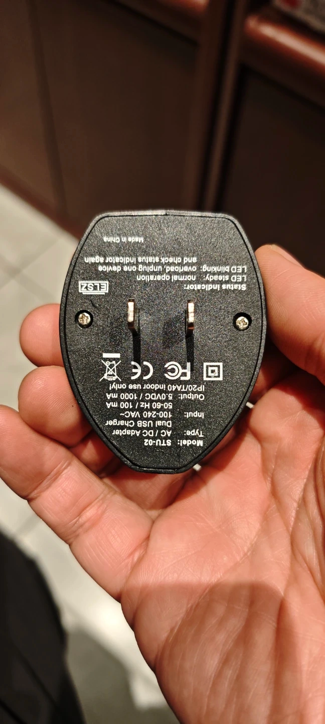 This is a PPG AP Academy Dual USB AC DC adapter. It's model number is STU-02. It operates on 100-240V AC input and outputs 5V DC, 1A. It has dual USB ports. The adapter has an LED status indicator.