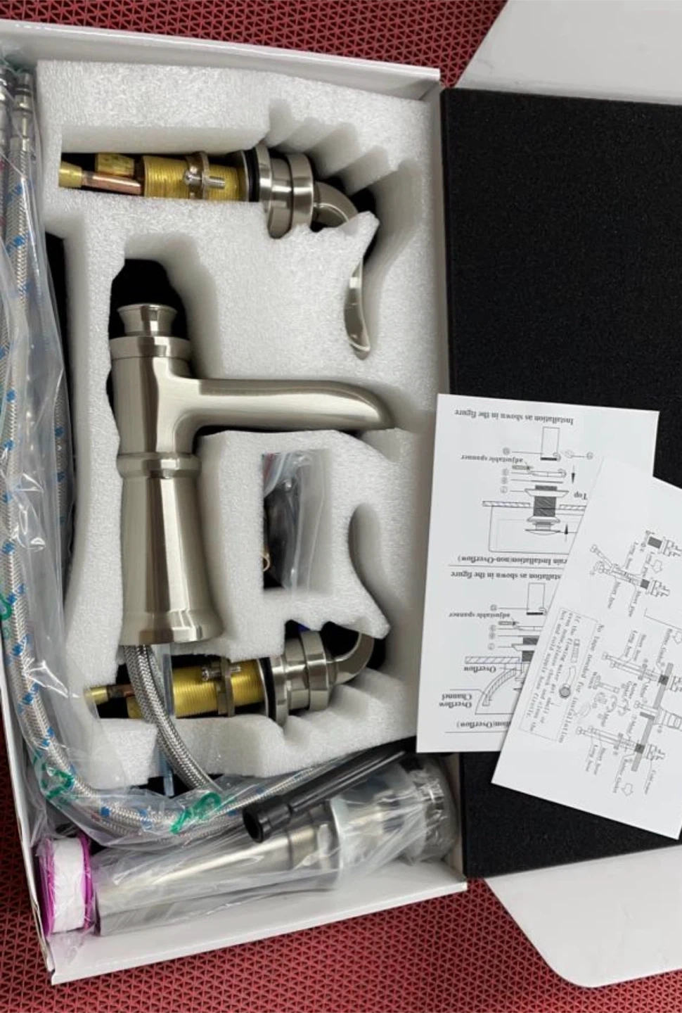 This is a brushed nickel bathroom faucet. It's a single-handle design. Includes hoses and installation instructions.