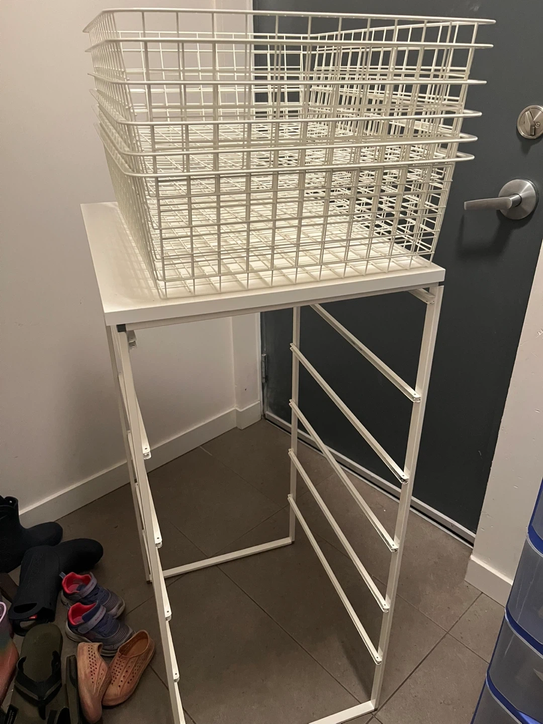 This is a white metal wire storage basket. It's made of sturdy metal wire construction. It's great for organizing various items around the home. It's ideal for small spaces or laundry rooms!