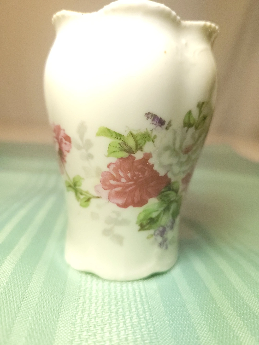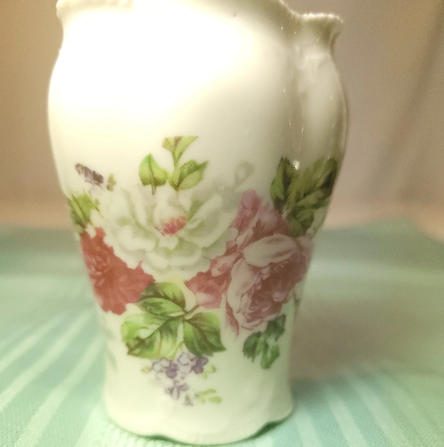Up for sale is a beautiful mid-century porcelain creamer featuring the timeless "Moss Rose" pattern. This piece showcases a delicate pink rosebud design with soft green foliage on a crisp white porcelain body. It is accented with an elegant scalloped rim and a classic C-scroll handle, both finished with rich gold gilding. This shape is a quintessential example of 1950s Japanese export porcelain, known for its translucency and fine craftsmanship.