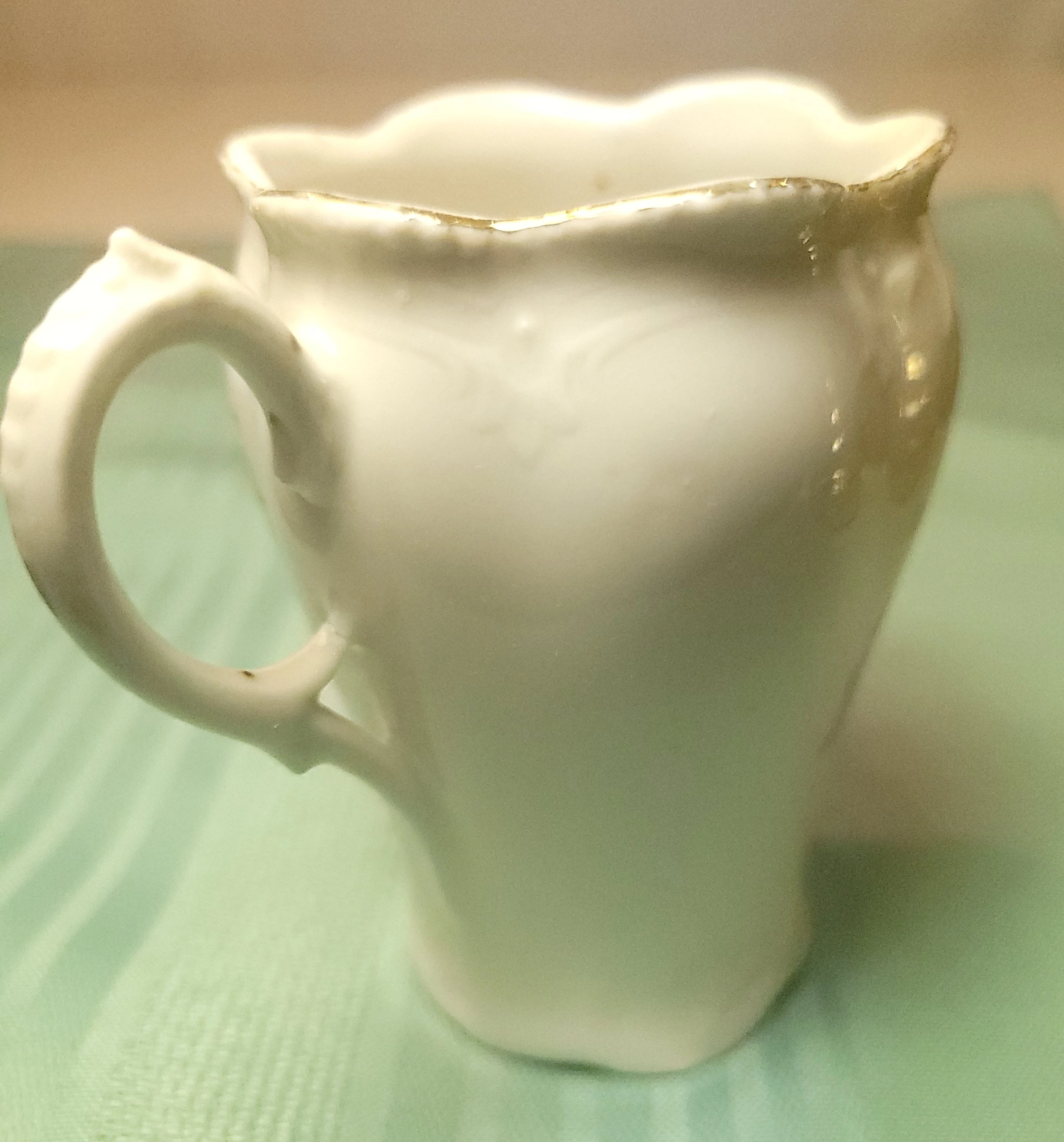 Up for sale is a beautiful mid-century porcelain creamer featuring the timeless "Moss Rose" pattern. This piece showcases a delicate pink rosebud design with soft green foliage on a crisp white porcelain body. It is accented with an elegant scalloped rim and a classic C-scroll handle, both finished with rich gold gilding. This shape is a quintessential example of 1950s Japanese export porcelain, known for its translucency and fine craftsmanship.
