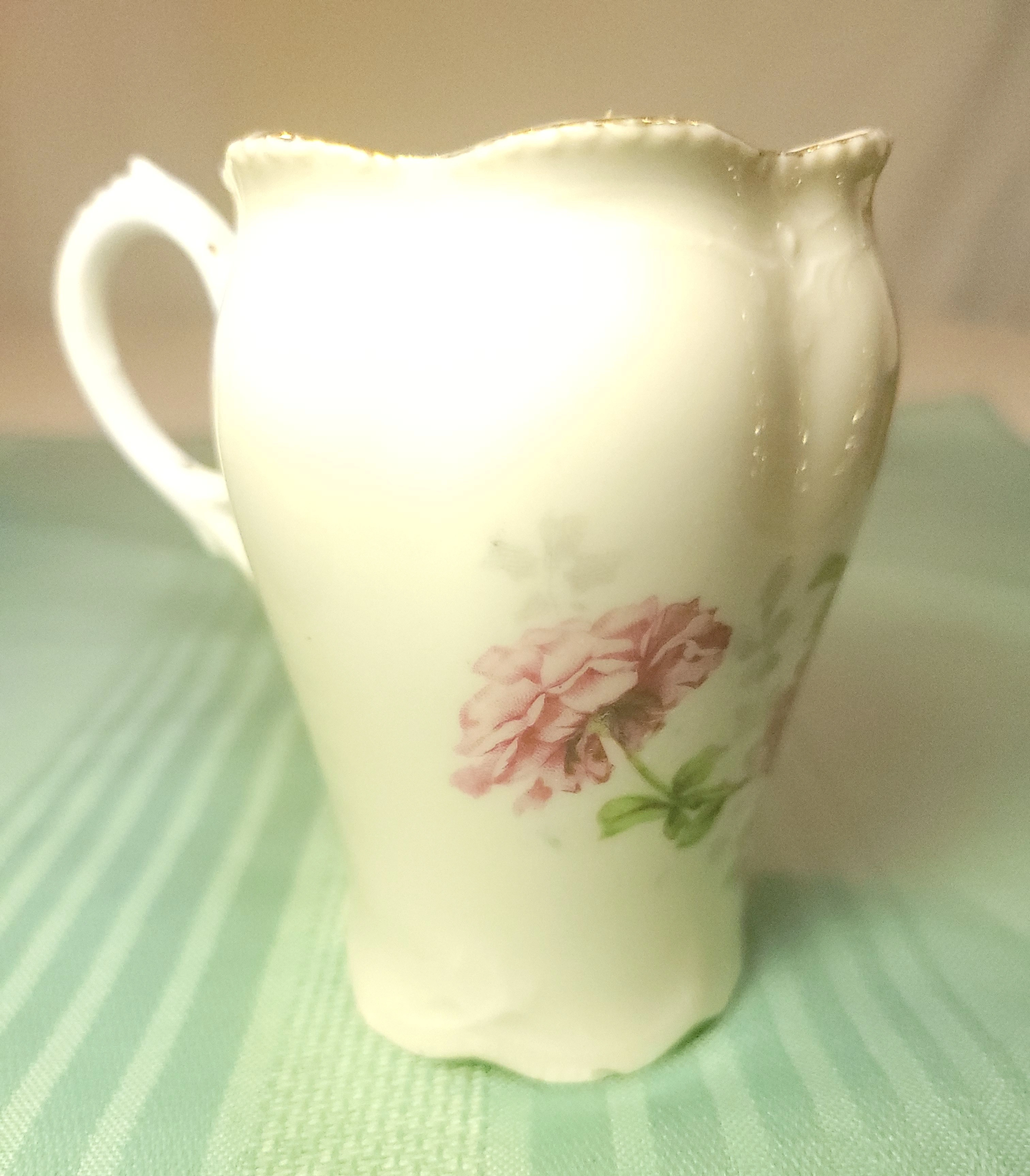 1950s Porcelain Creamer - Pink Moss Rose Pattern, Scalloped Gold