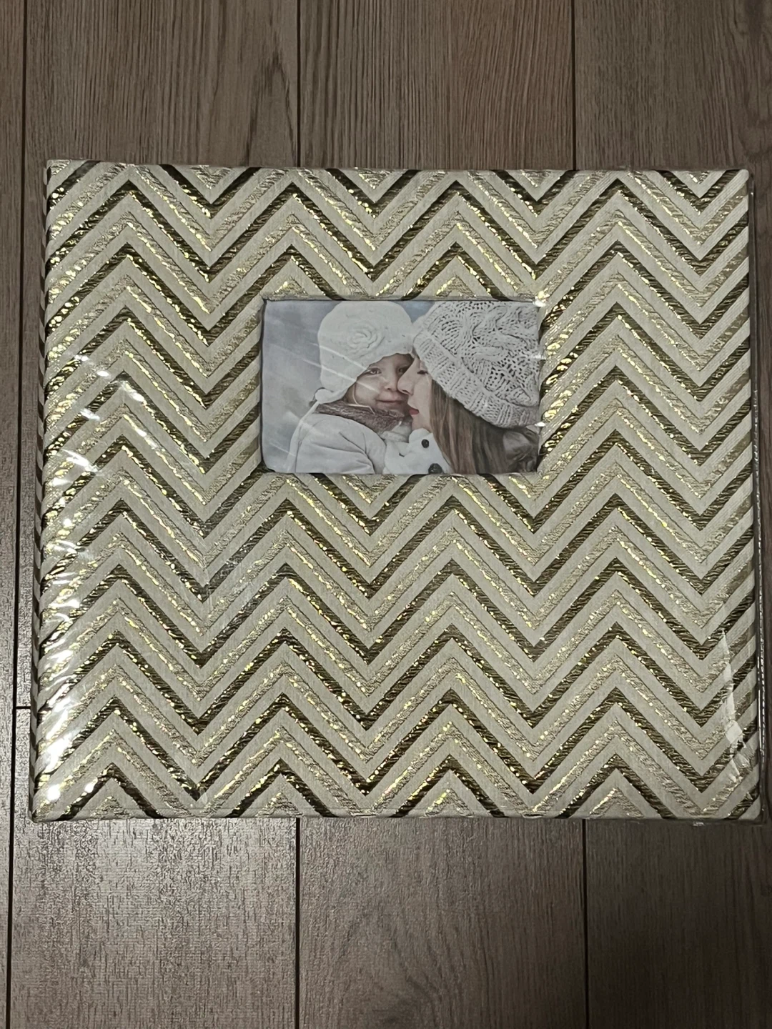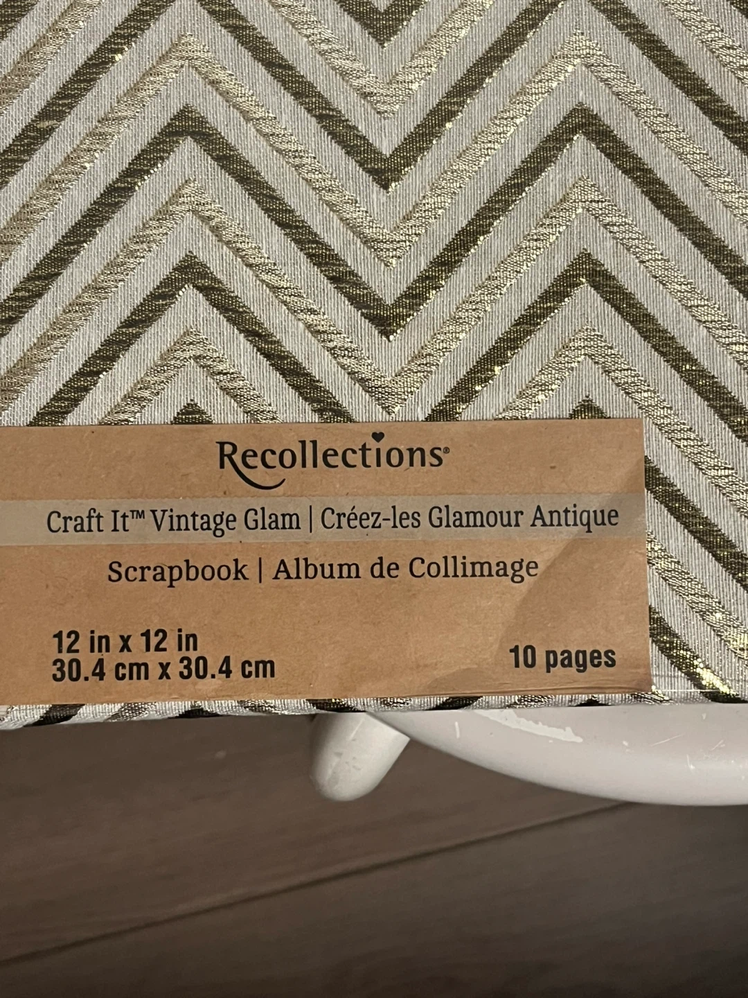 This Recollections scrapbook measures 12 by 12 inches and comes with 10 pages. It has a gold and cream chevron pattern with a photo frame on the front. Perfect for preserving memories!