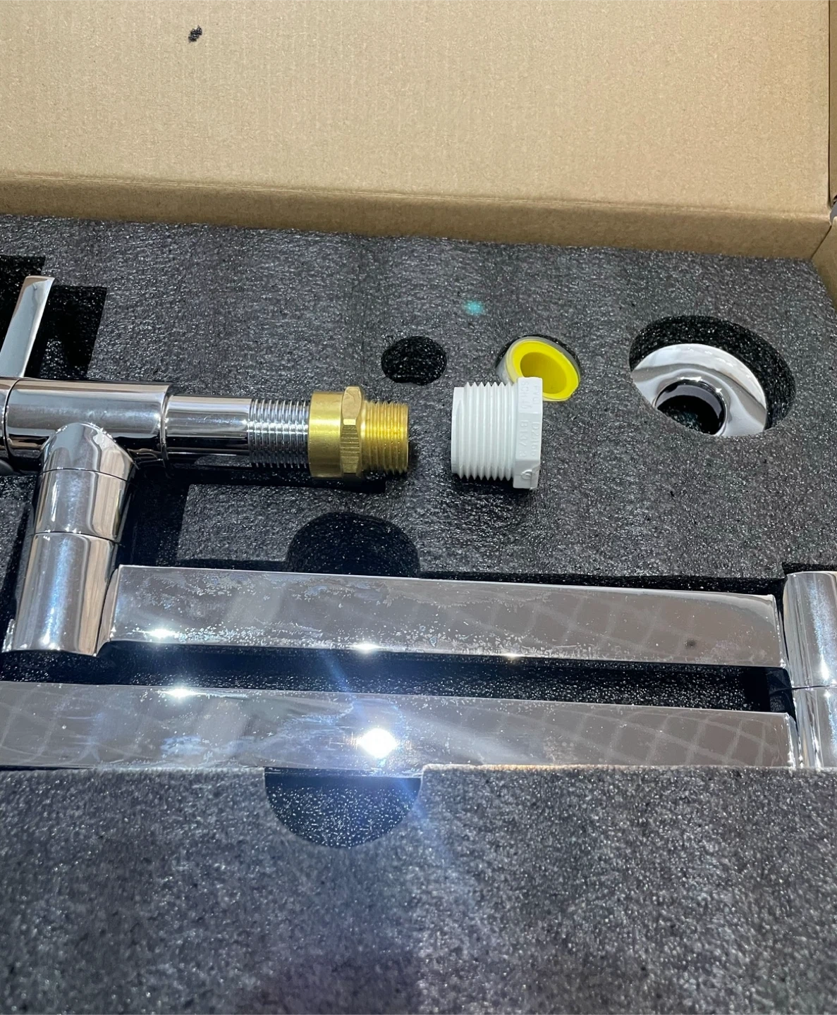 This pot filler faucet is made of chrome-plated brass. It's a dual-handle, wall-mounted design. It extends 230mm (9.06") and has a 196mm (7.72") spout reach. It comes with installation parts.