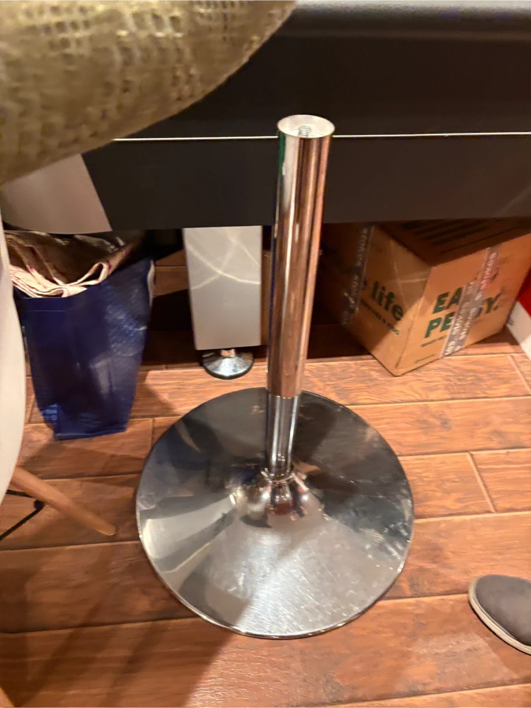 Round glass tabletop with a sturdy chrome pedestal base. Tabletop is 40 inches in diameter. Perfect for a breakfast nook or small dining area!
