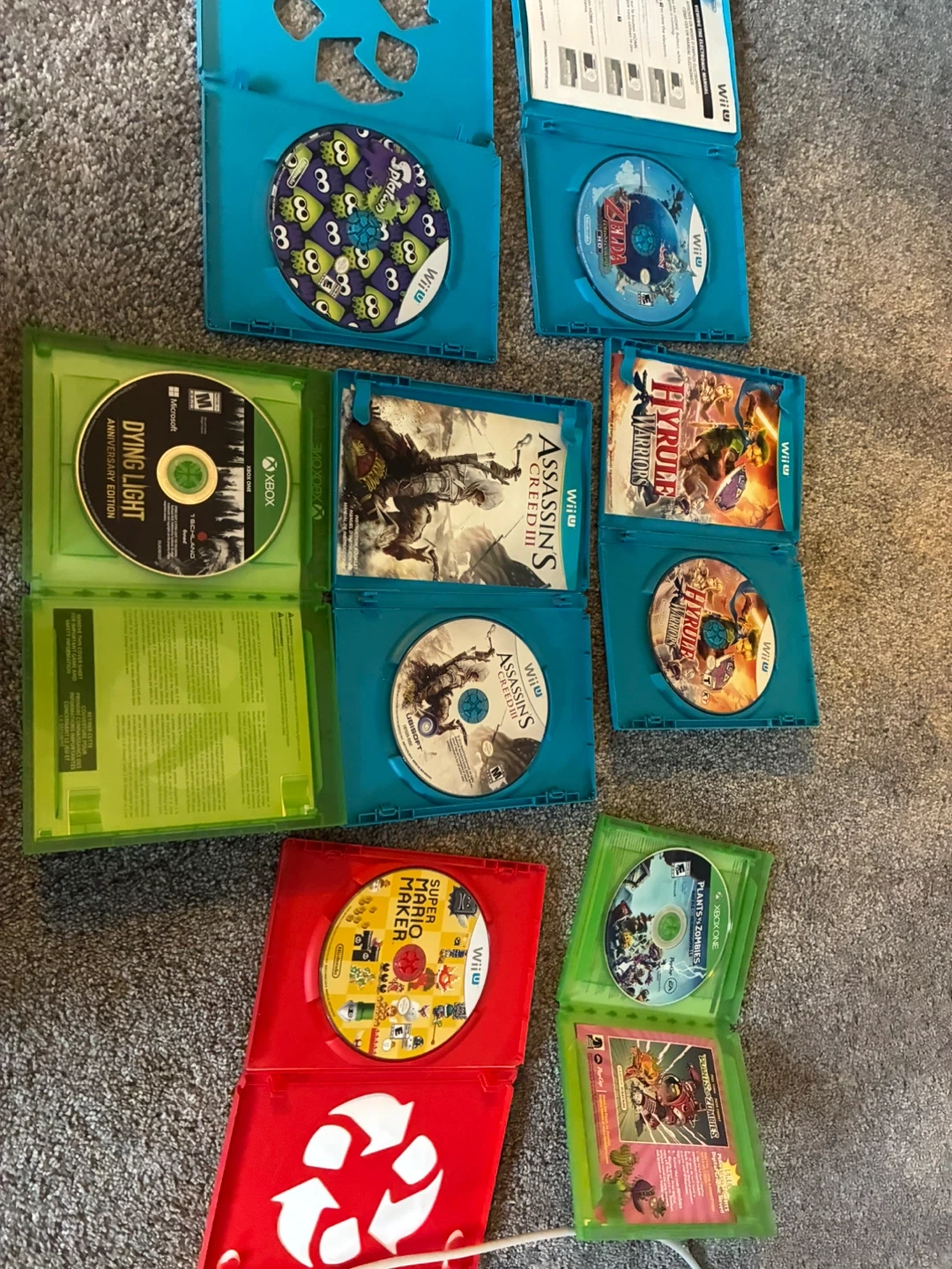 This bundle includes several video games for Nintendo Wii U and Xbox consoles. You'll get Splatoon, Zelda, Assassin's Creed III, Hyrule Warriors, and Super Mario Maker for Wii U. The Xbox One games are Dying Light Anniversary Edition, and Plants vs. Zombies. Games are sold with the case