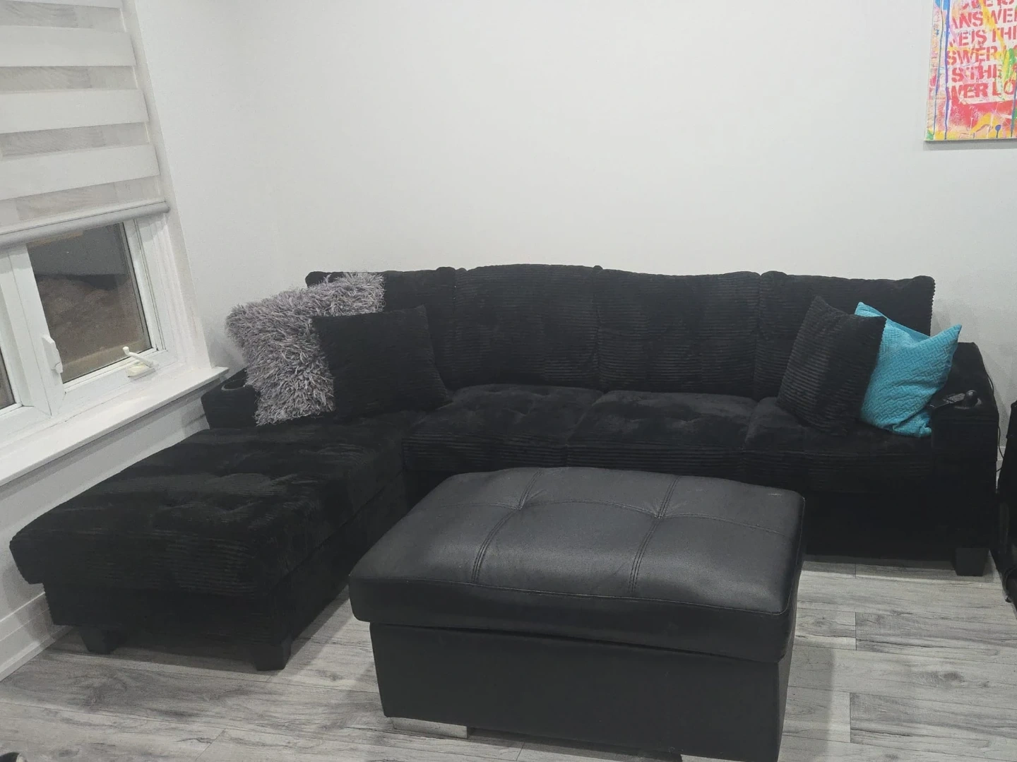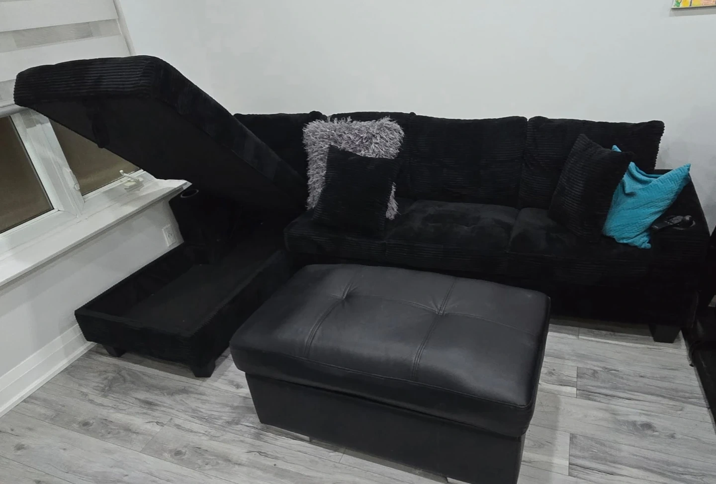 This black corduroy sectional sofa comes with a matching storage ottoman. It's got tons of space for lounging and extra storage. Includes decorative pillows and ottoman.