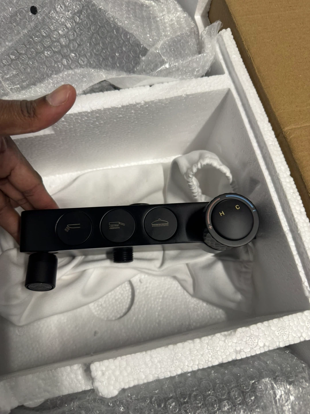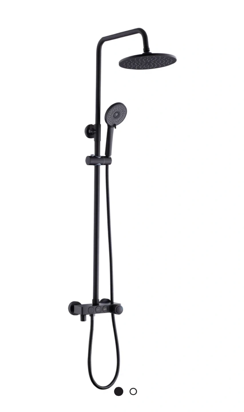 Brand new black shower faucet system. Features a rainfall shower head and a handheld shower wand. Includes the main control panel with multiple settings. This system is designed for a modern bathroom update.