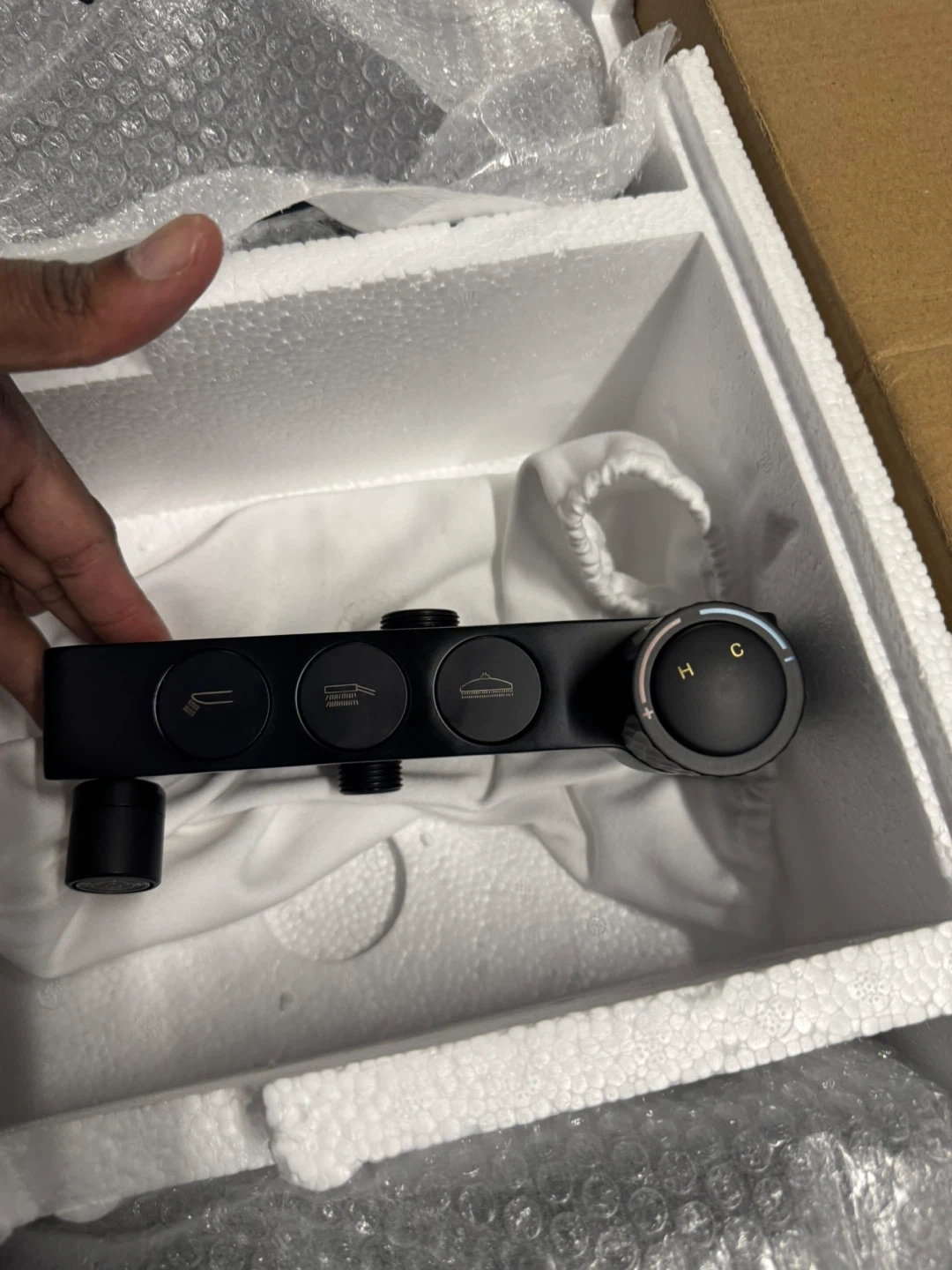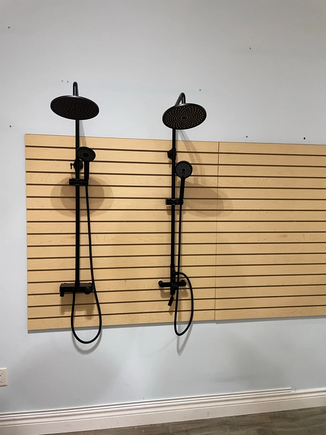 Brand new black shower faucet system. Features a rainfall shower head and a handheld shower wand. Includes the main control panel with multiple settings. This system is designed for a modern bathroom update.