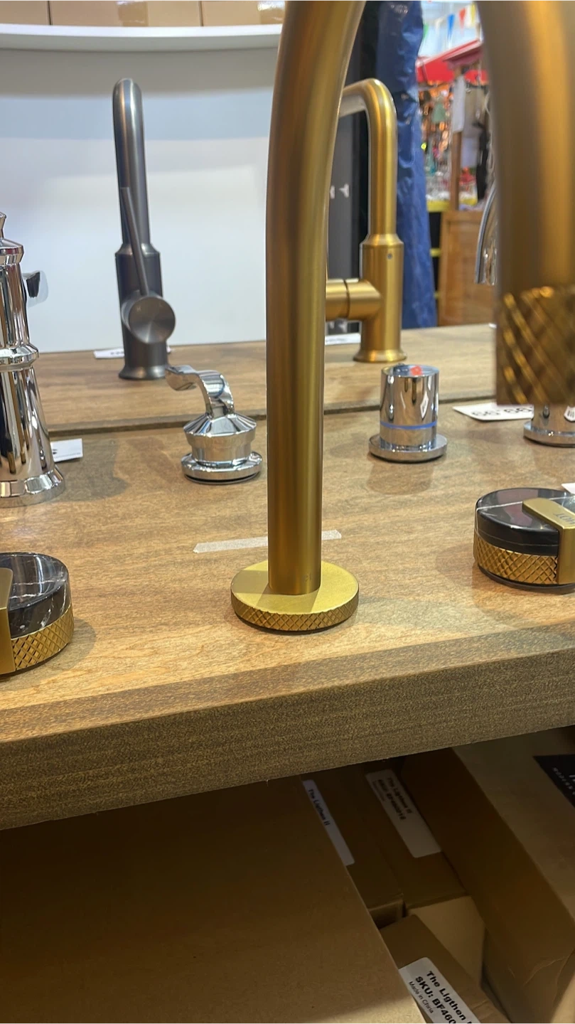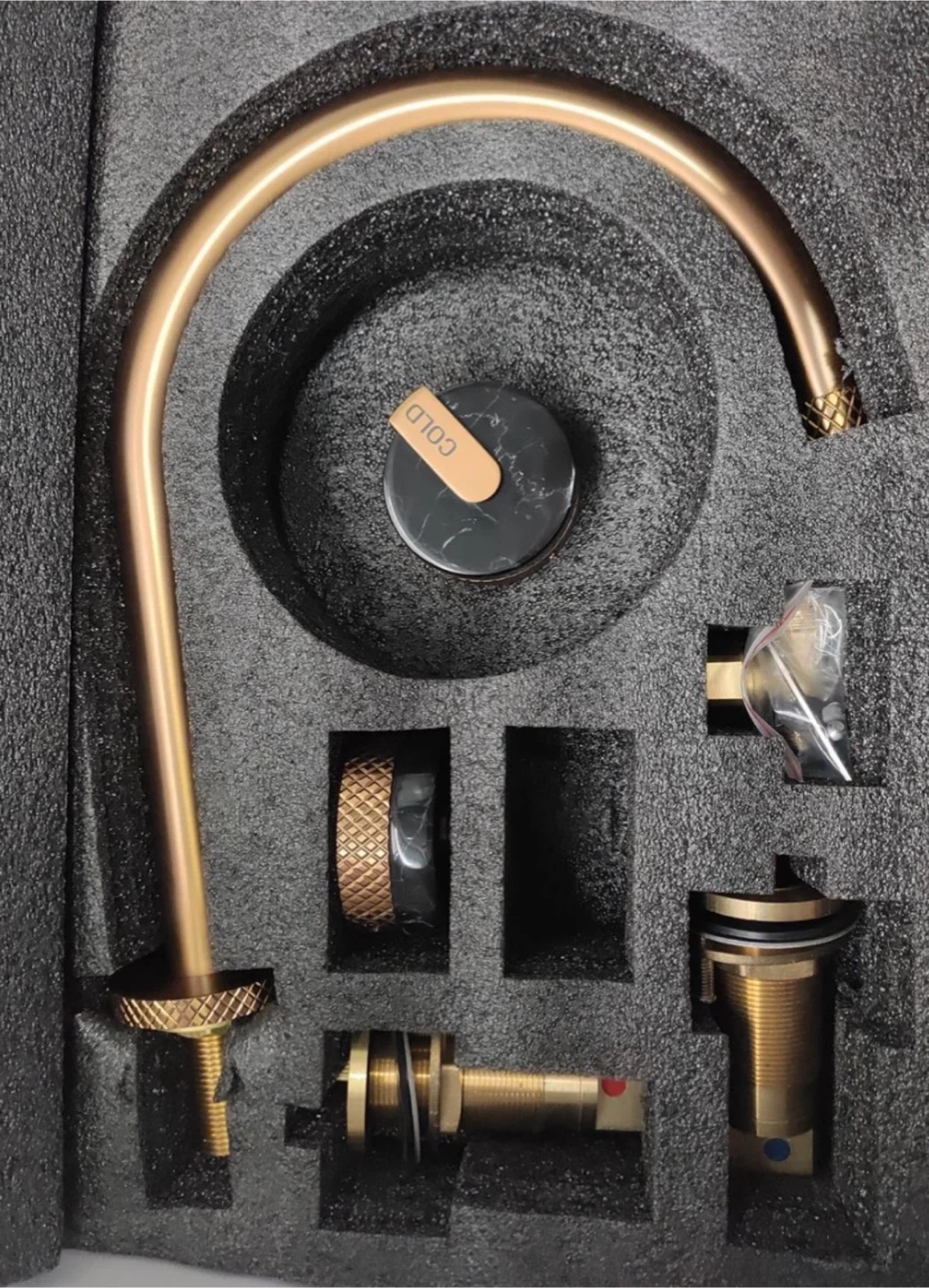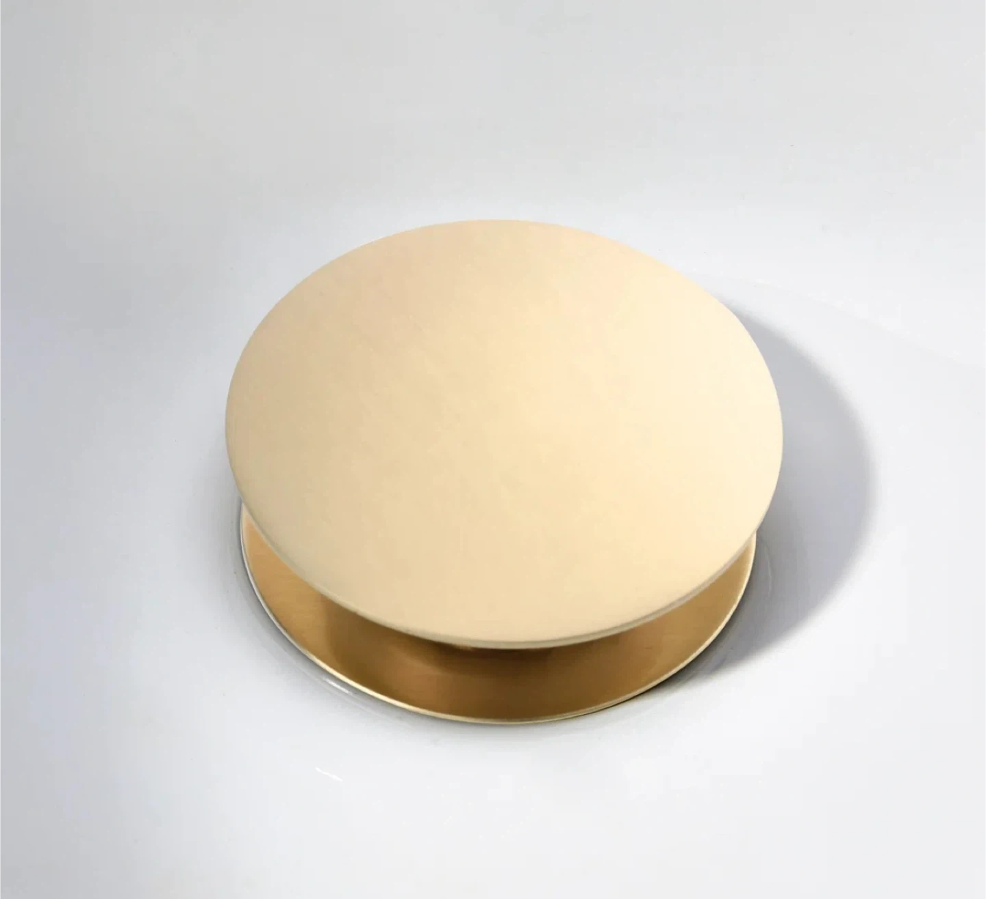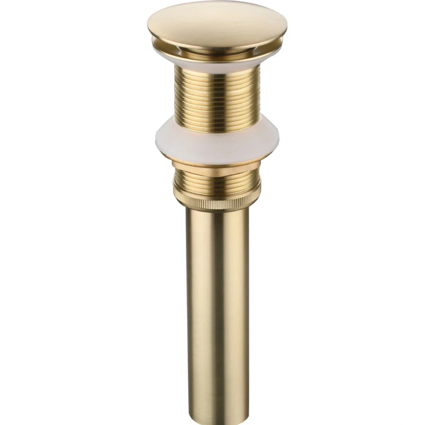 A beautiful gold-finished faucet with a modern design. It includes a matching pop-up drain assembly. This set is perfect for upgrading your bathroom or kitchen sink.