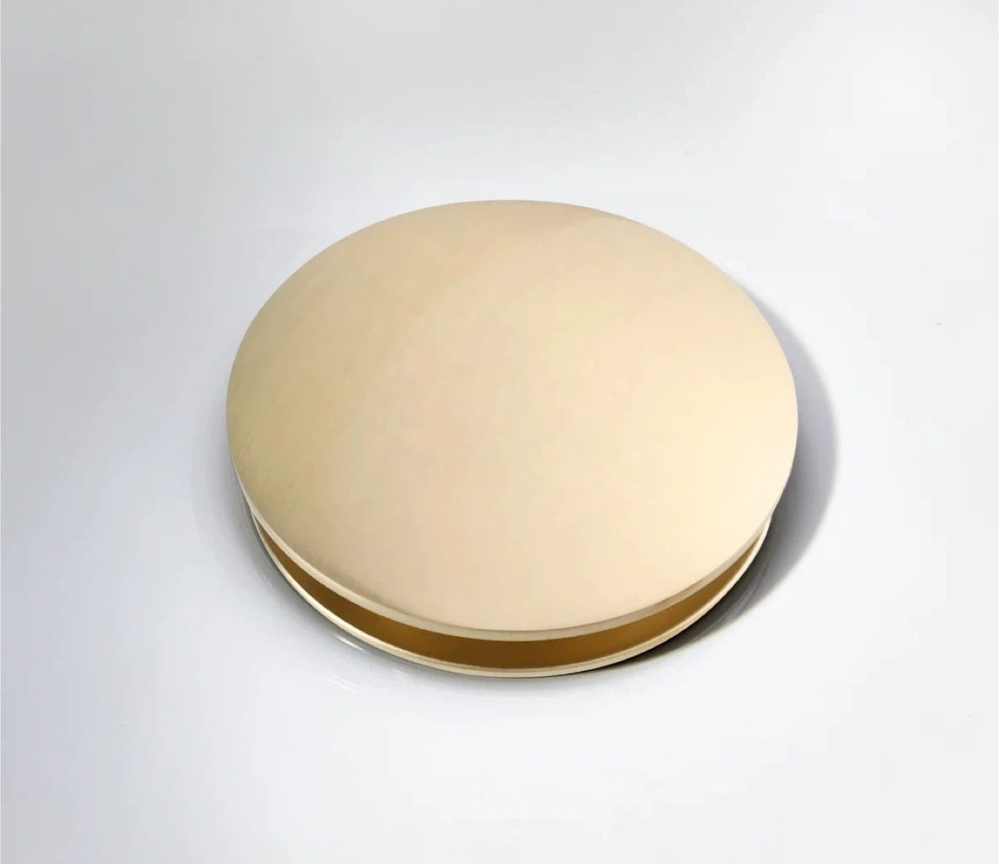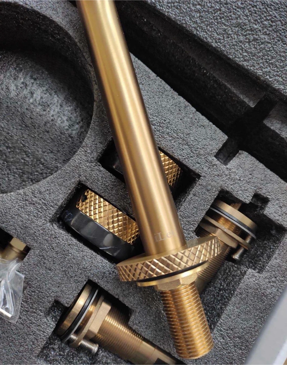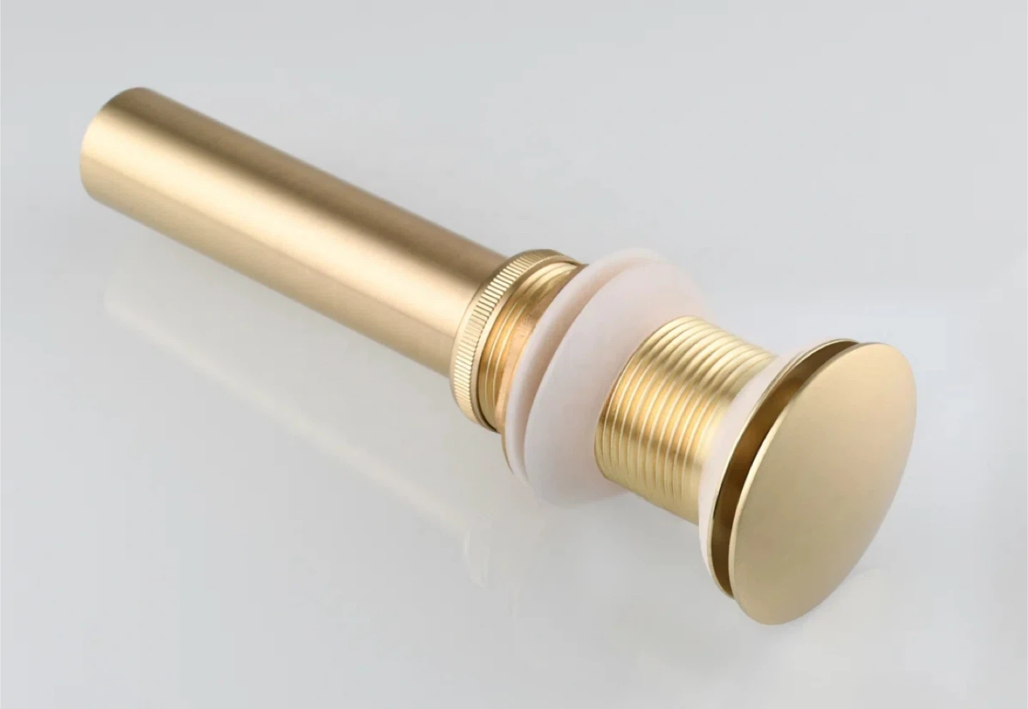 A beautiful gold-finished faucet with a modern design. It includes a matching pop-up drain assembly. This set is perfect for upgrading your bathroom or kitchen sink.