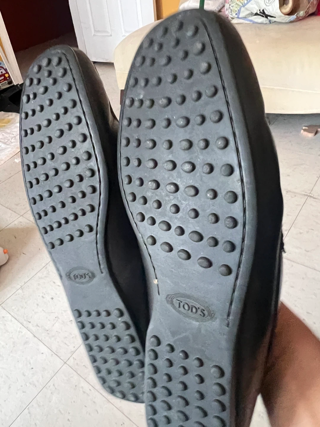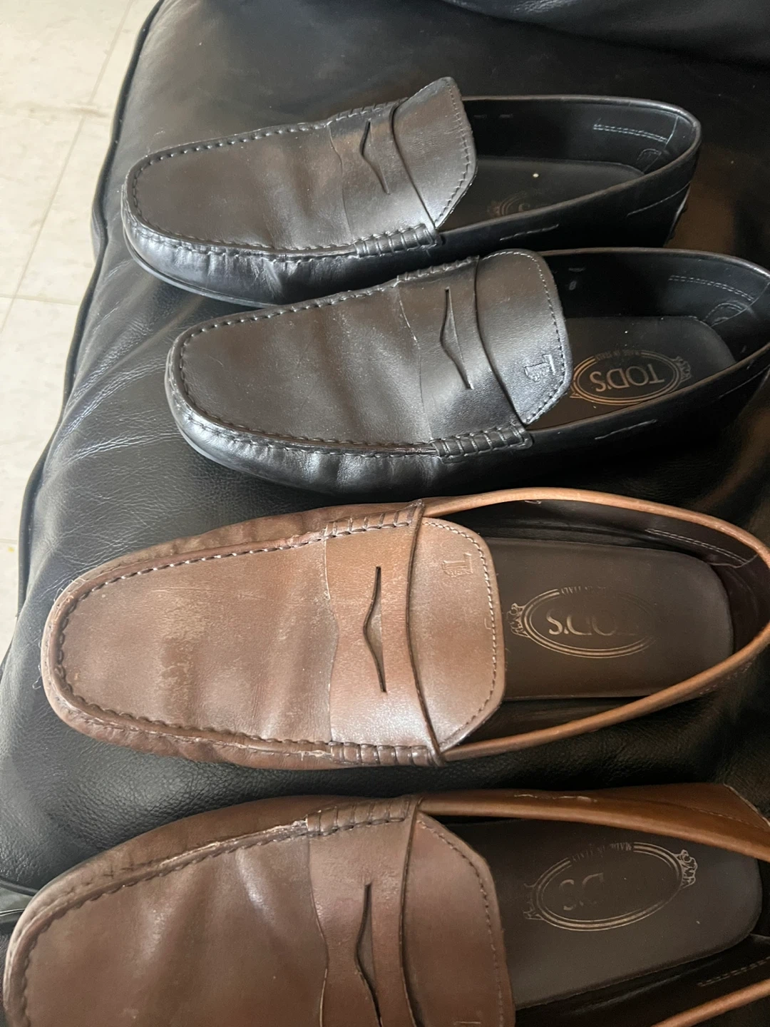 Classic Tod's driving moccasins. Crafted from genuine leather in a timeless design. These shoes are known for their comfort and iconic rubber pebble sole.
