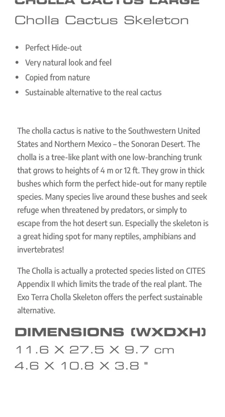 This Exo Terra Cholla Cactus provides a secure hiding place for reptiles. It's ideal for creating a humid microclimate in any terrarium. Made from food-grade resin.