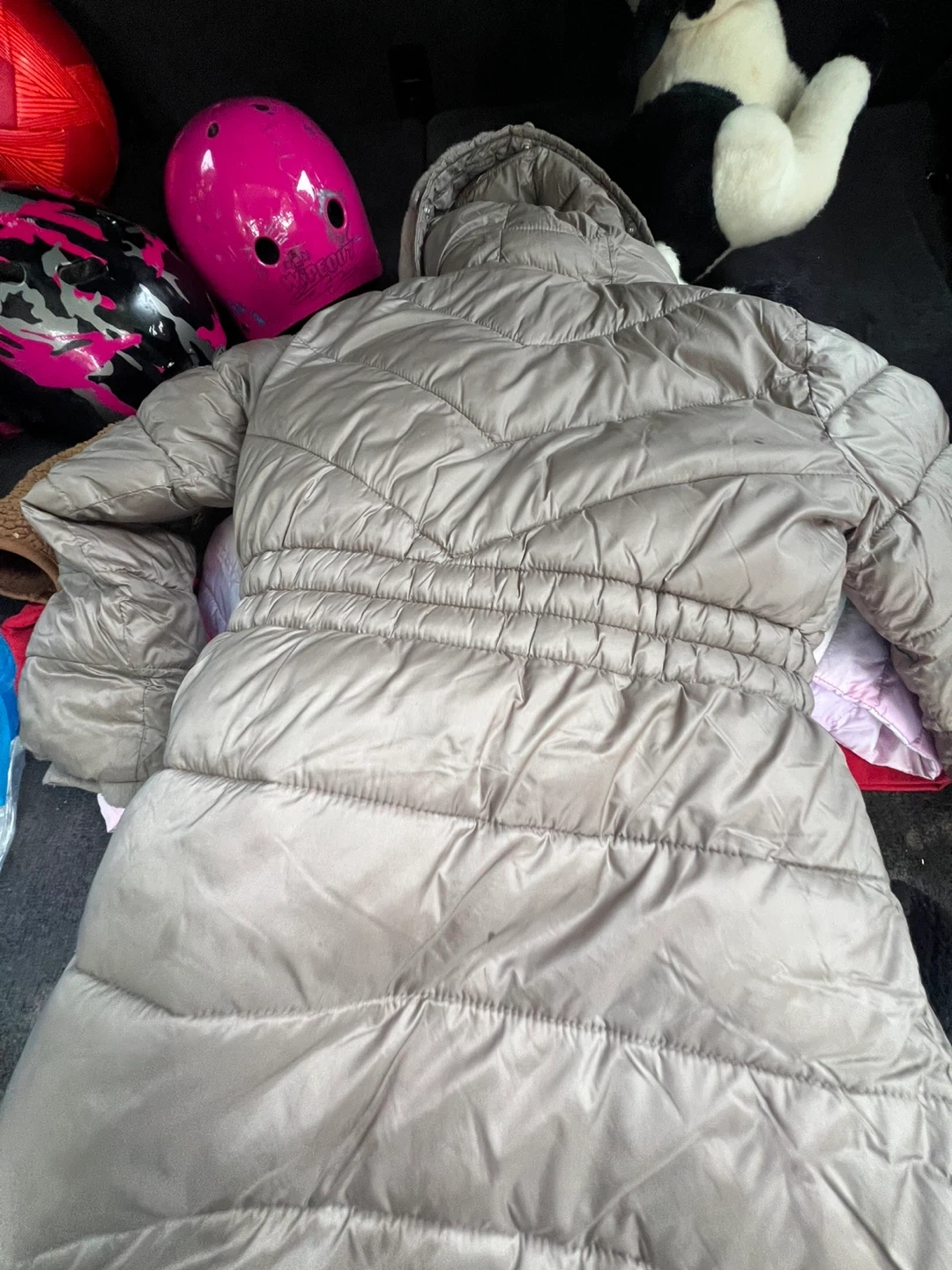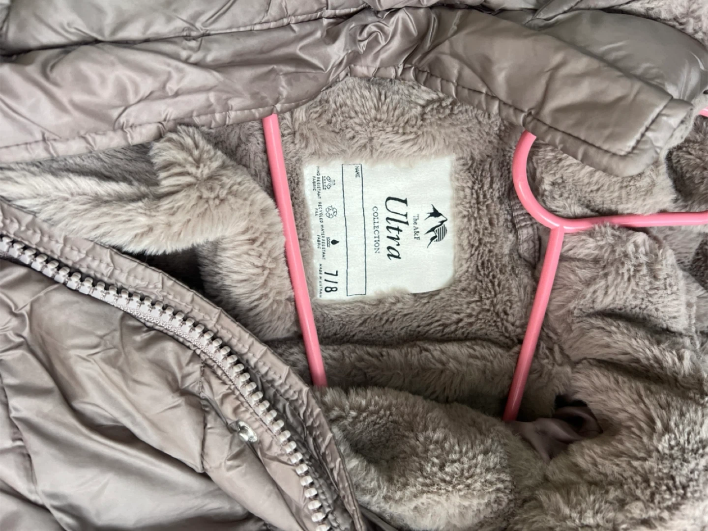 This is a girls' puffer coat from The A&F Ultra Collection. It's a size 7/8 and features a full zip front with a hood. The coat is a light tan color with a quilted design and a faux fur lining. It's a warm and stylish option for colder weather!