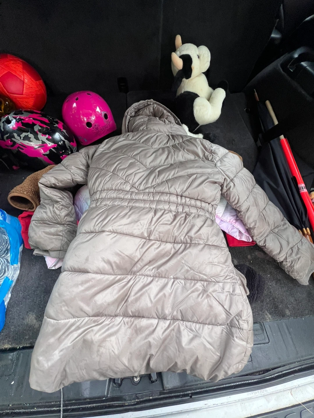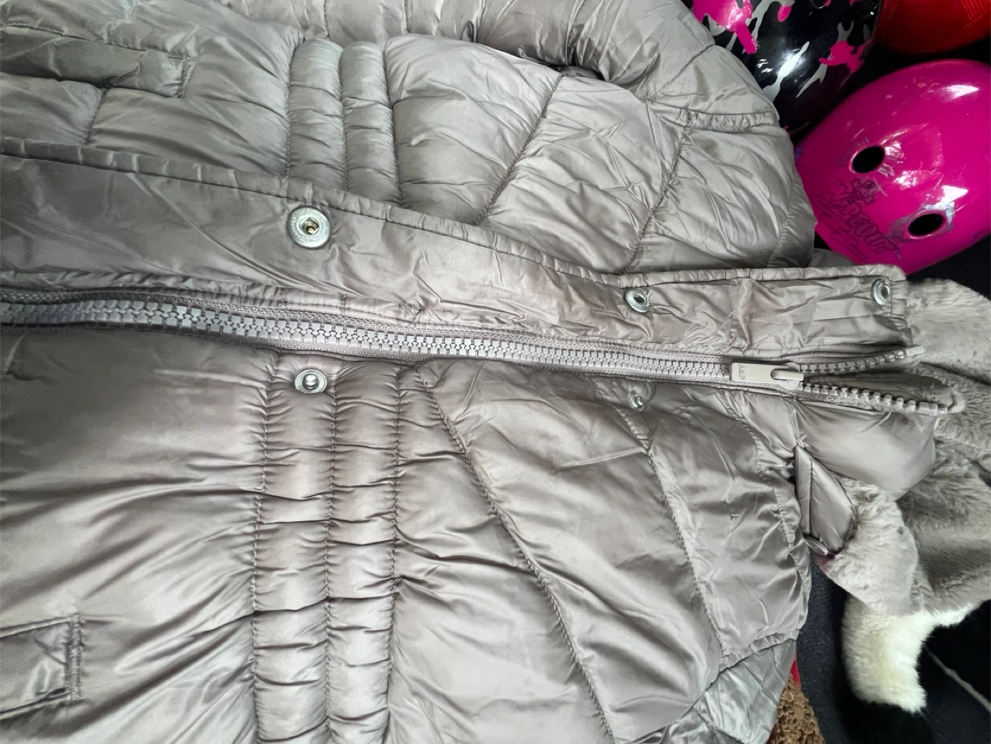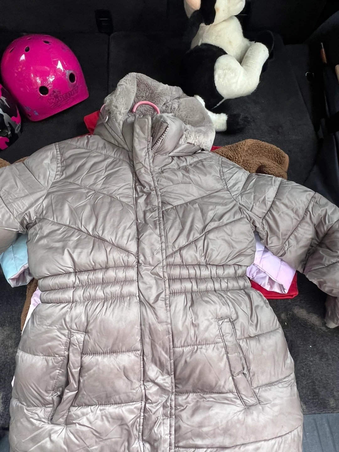This is a girls' puffer coat from The A&F Ultra Collection. It's a size 7/8 and features a full zip front with a hood. The coat is a light tan color with a quilted design and a faux fur lining. It's a warm and stylish option for colder weather!