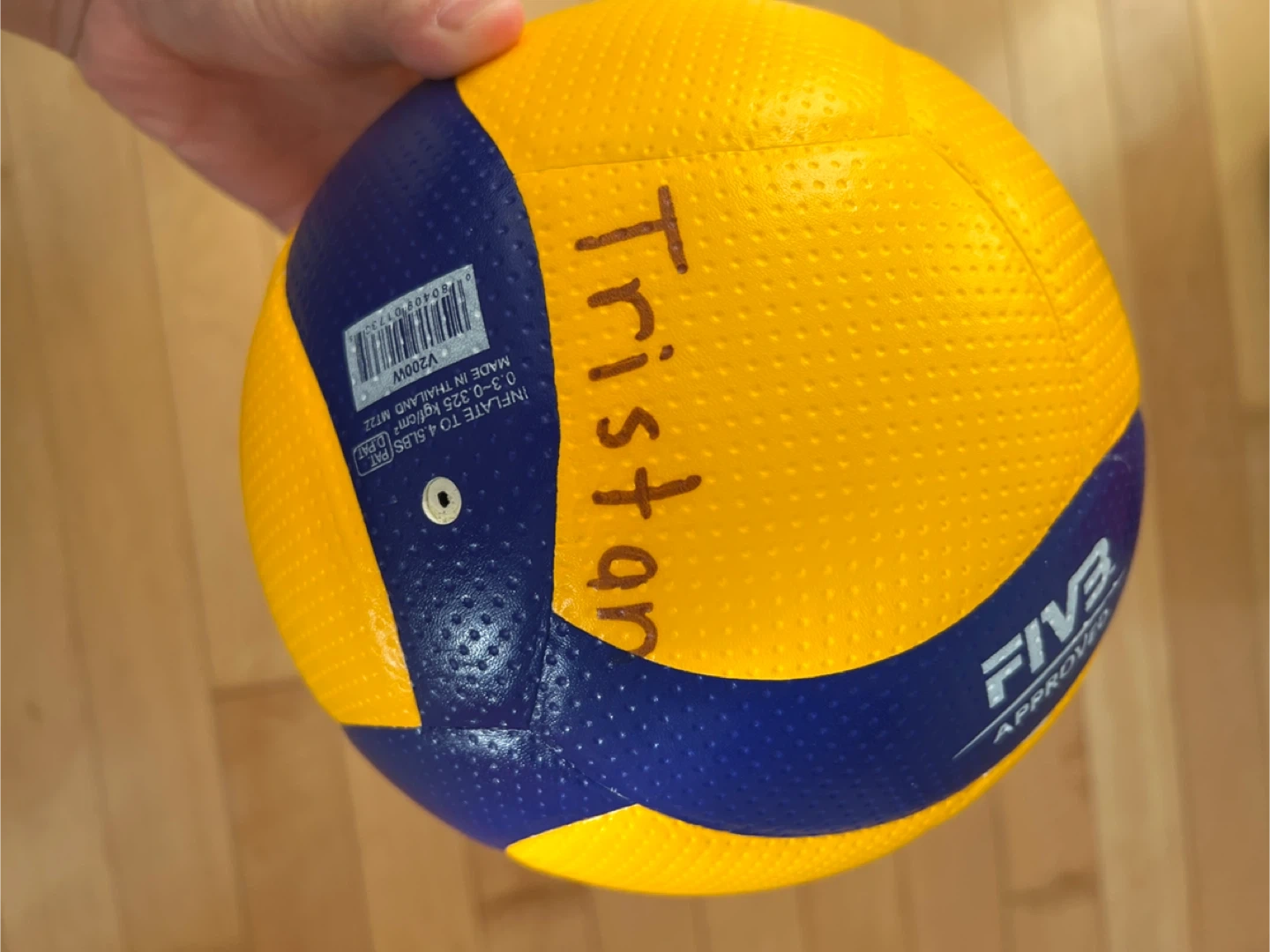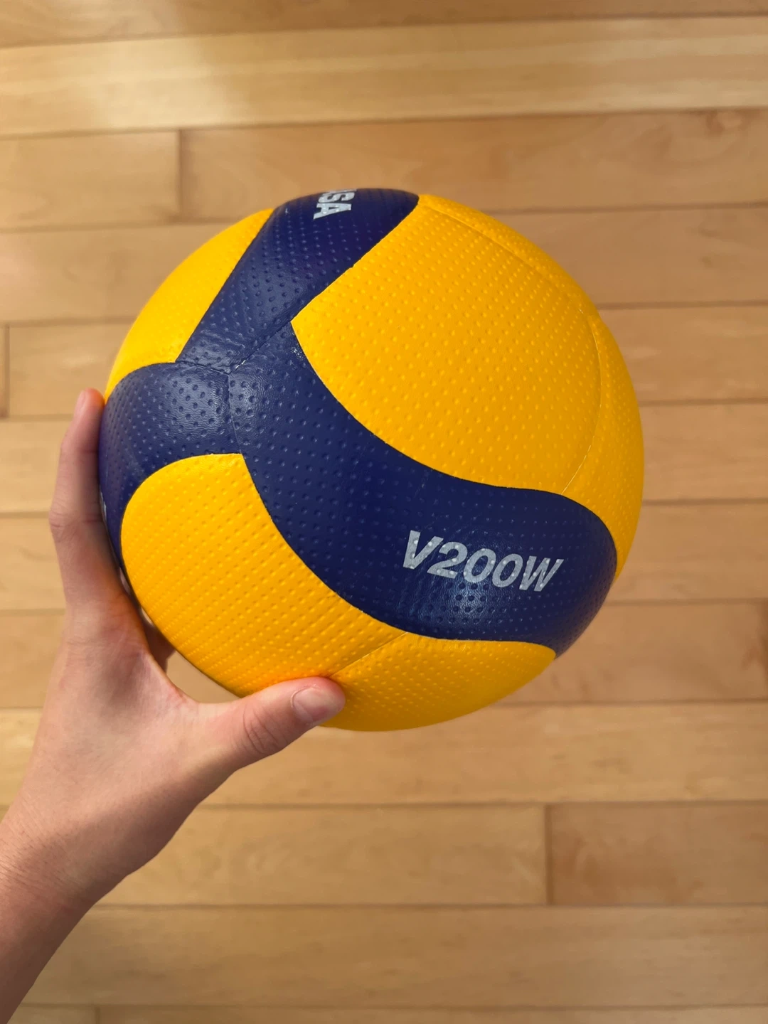 Yellow and blue Mikasa V200W volleyball. It's made in Thailand and designed for indoor play. Inflate to 0.1-0.15kgf/cm² or 1.5-2.2 PSI.