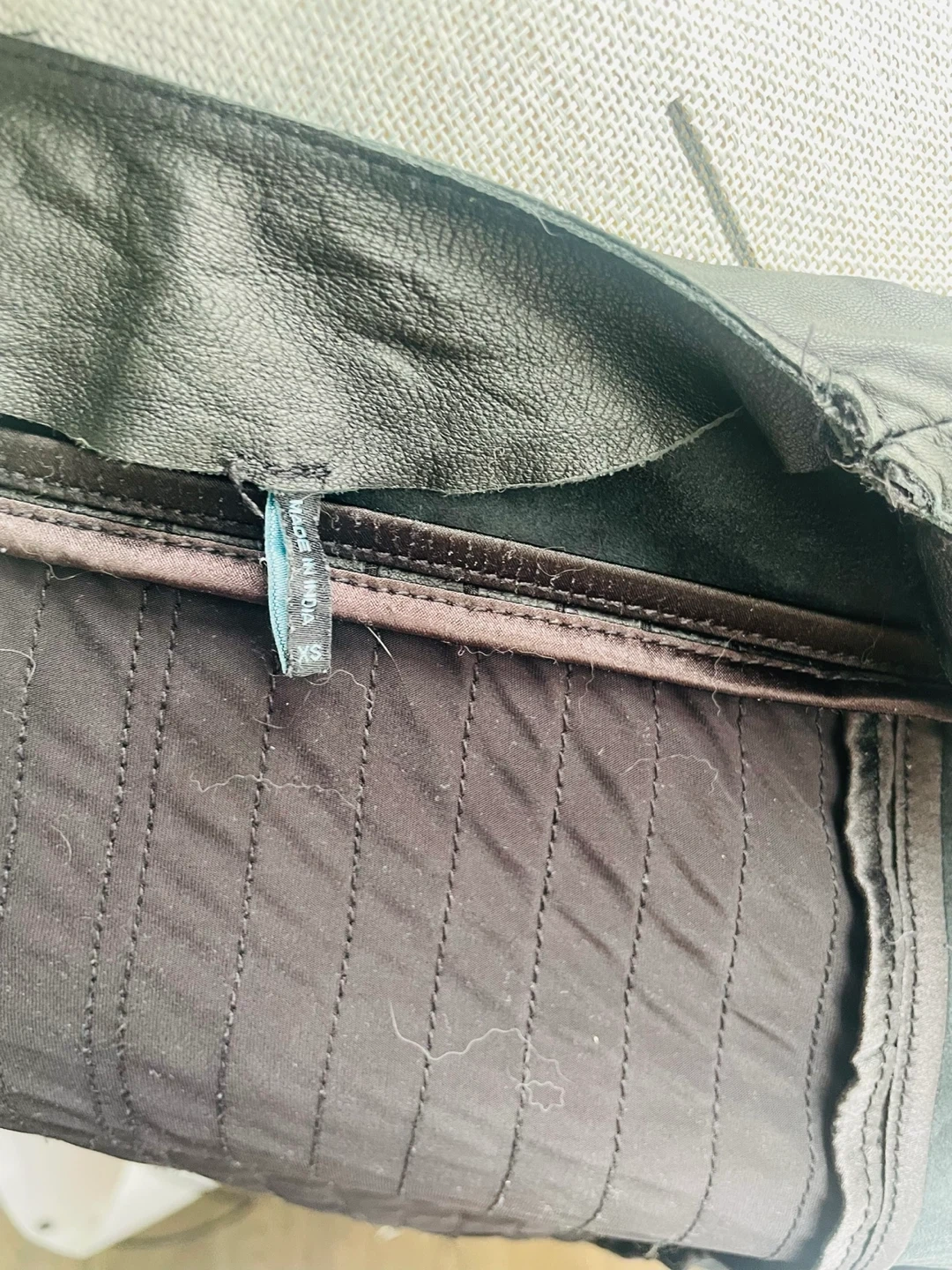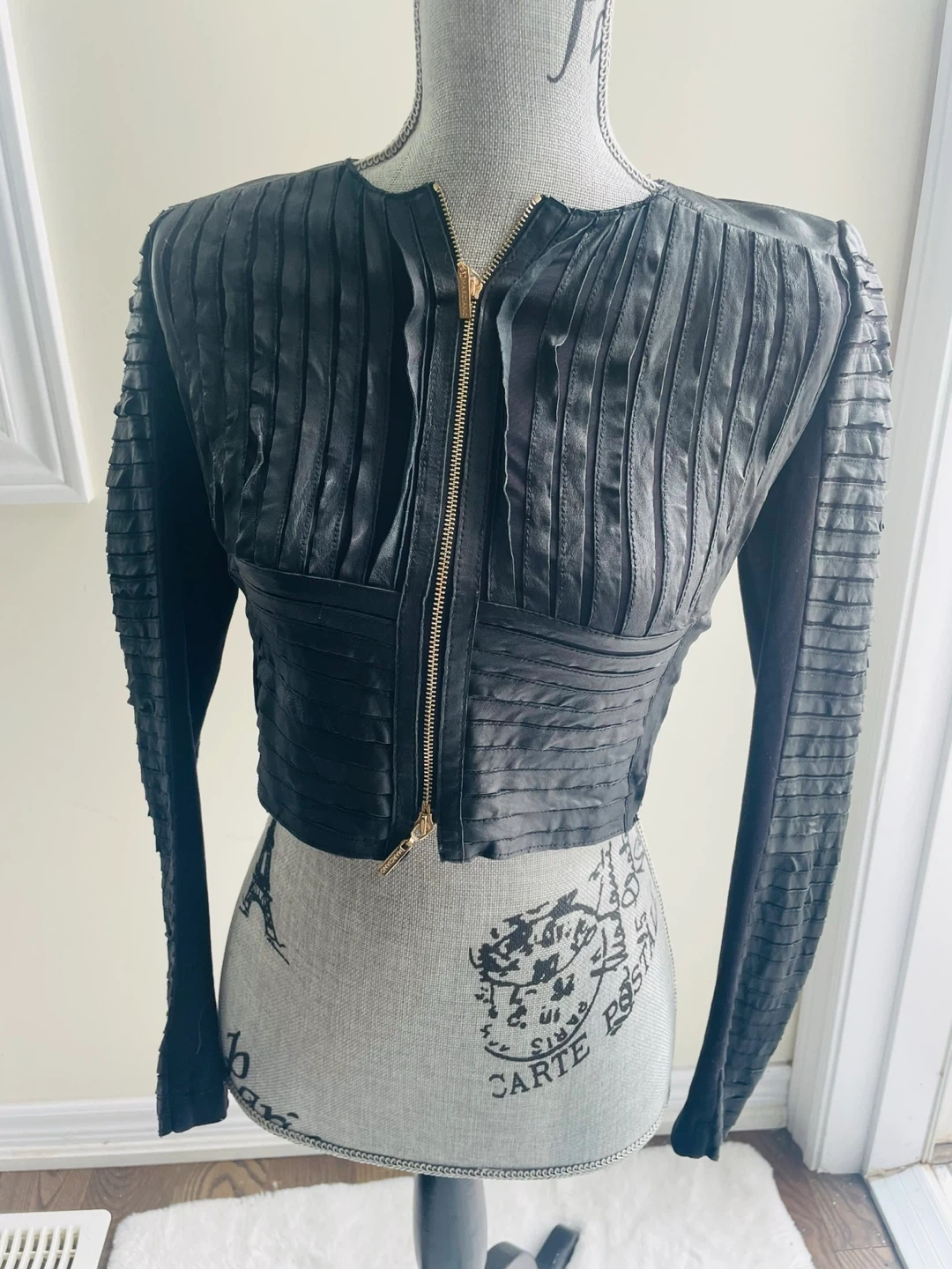 This black jacket features a unique pleated design with a zip-up front. Made from leather, it's cropped in length and has long sleeves. Size XS.