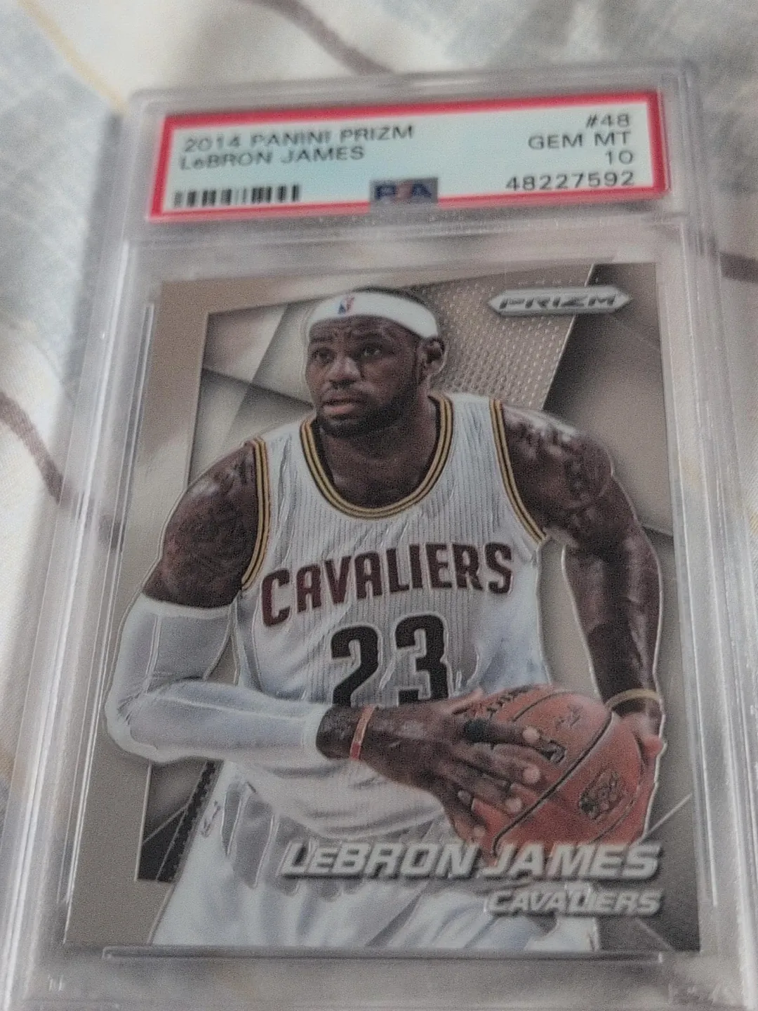 This is a 2014 Panini Prizm basketball card featuring LeBron James. It's graded GEM MT 10 by PSA. The card number is #48. This card would be a great addition for any serious basketball collector!